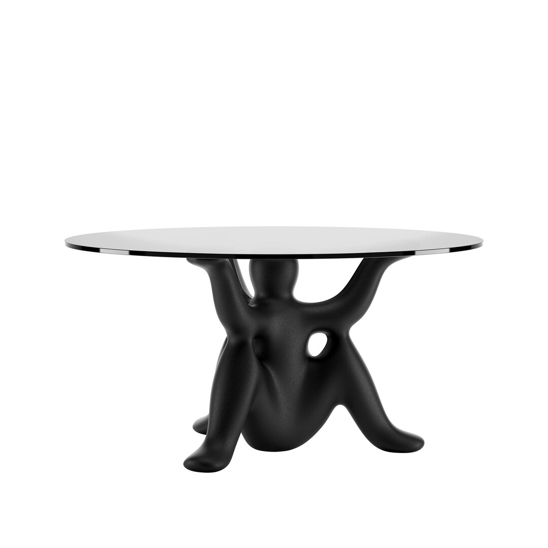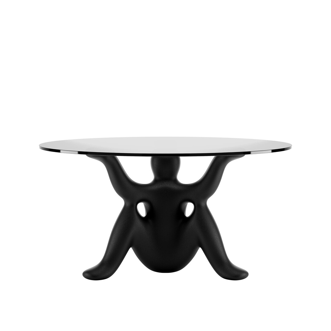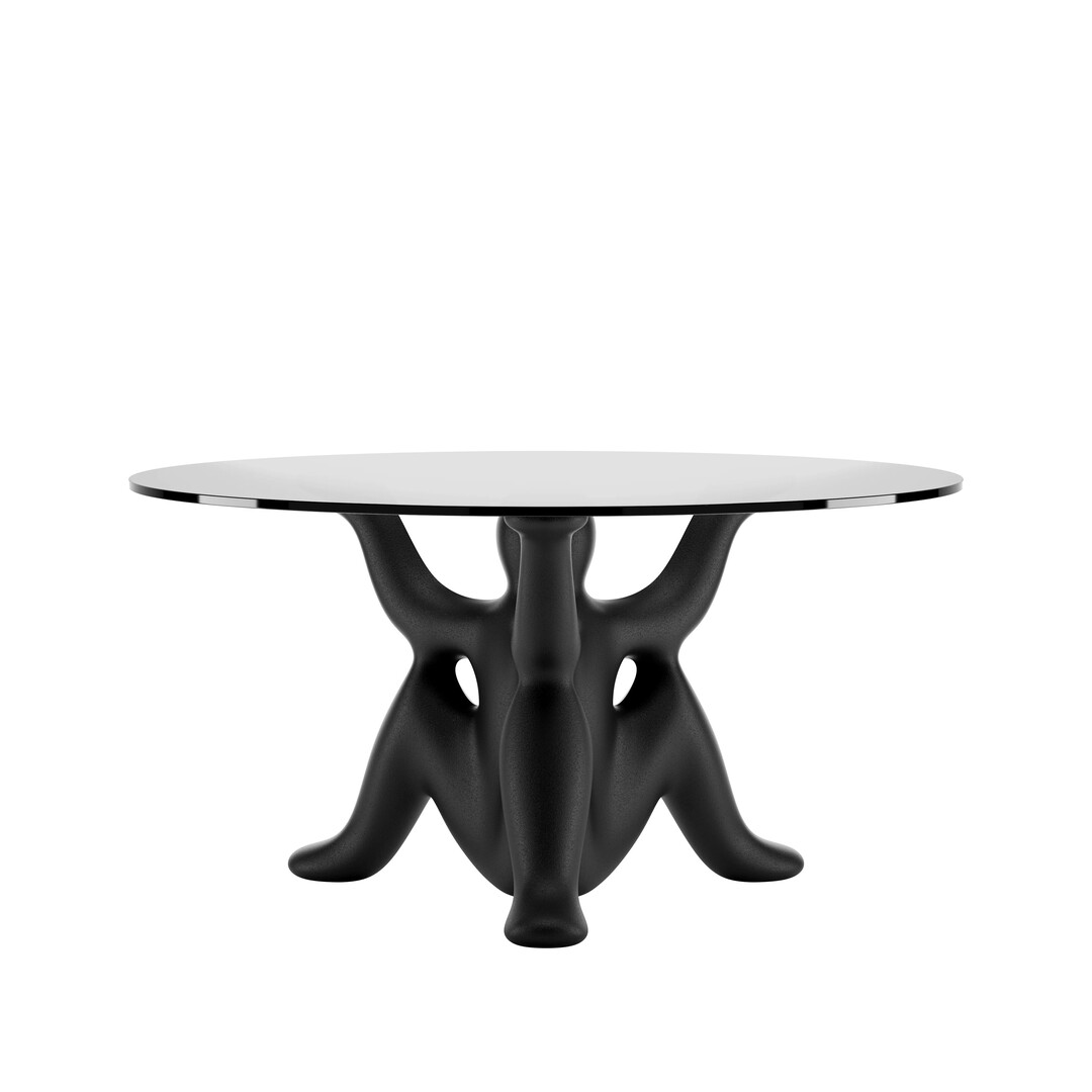 テーブルのベースが、人の形をしています。三本の脚と三本の腕を持つ像が三体、背中合わせに連なってひとつのベースを形作り、天板を高く掲げる構造です。