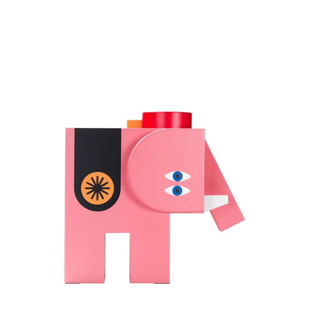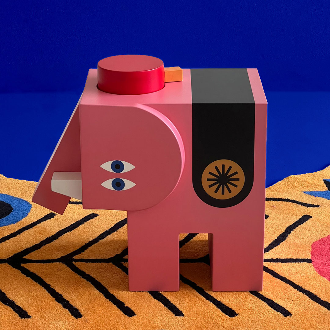 ジャンボ(ゾウのコーヒーテーブル)をソファ前に置き、クロコピンクのシェイプド カーペットを床に敷き、クッションを数枚並べる。3点だけで、部屋はオッジャンの展覧会場に変貌します。