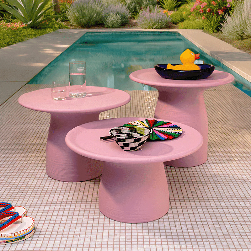 3台を段違いで並べると自然なネストテーブルの配置になります。カラーはホワイト、グリーン、インディアンレッド、ピンク、ダブグレーほか展開。屋内外対応。