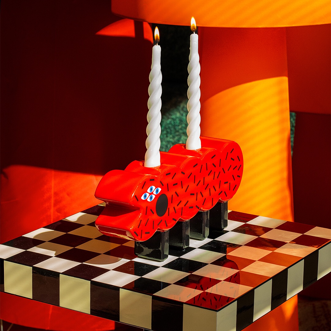 フラワーベース、キャンドルスティック、プフ、クッション、カーペット、コーヒーテーブル、ウォールクロックの全7カテゴリにわたり、いずれの作品にもオッジャン独自の「大胆な原色×ユーモアある幾何学形×社会的メッセージ」というデザイン哲学が貫かれています。