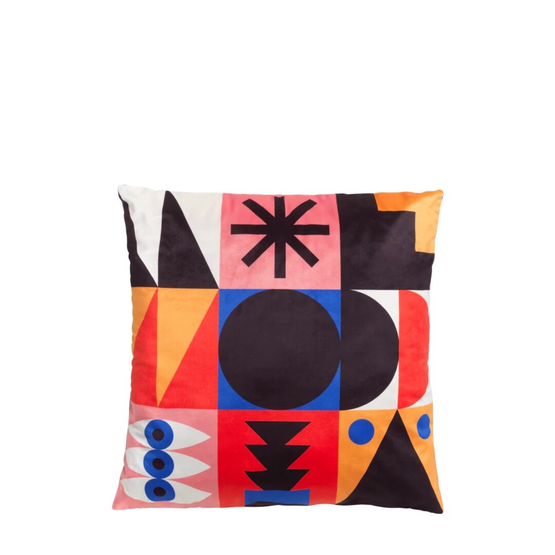 正方形45cmのクッションに、オッジャンのグラフィックが全面にプリントされています。