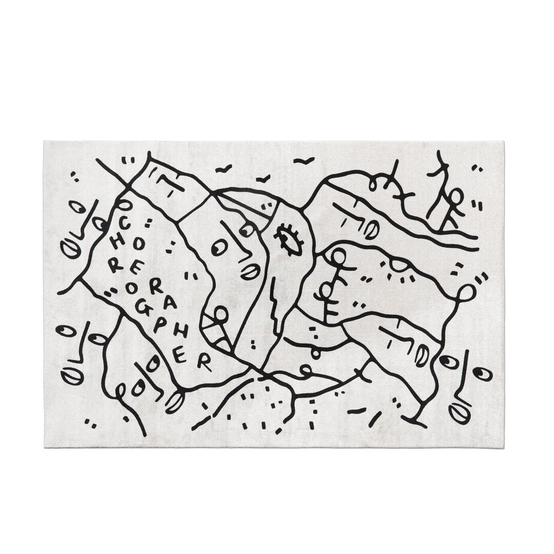 白地に黒い線・テキスト・記号が躍るモノクロームのデザインは、彼女の芸術の核心として知られています。カーペット10種・クッション5種・プフ5種、計20アイテムが揃っています。