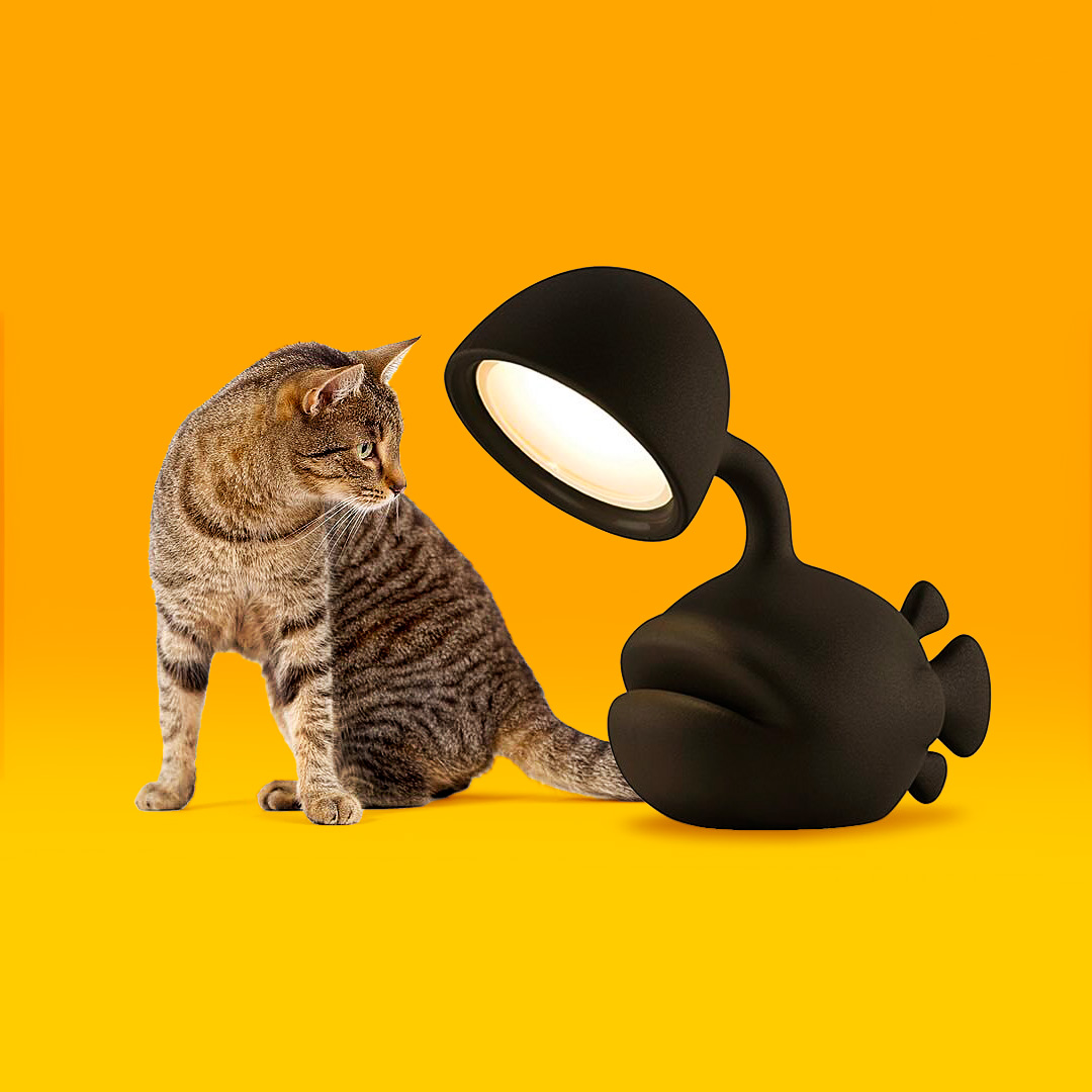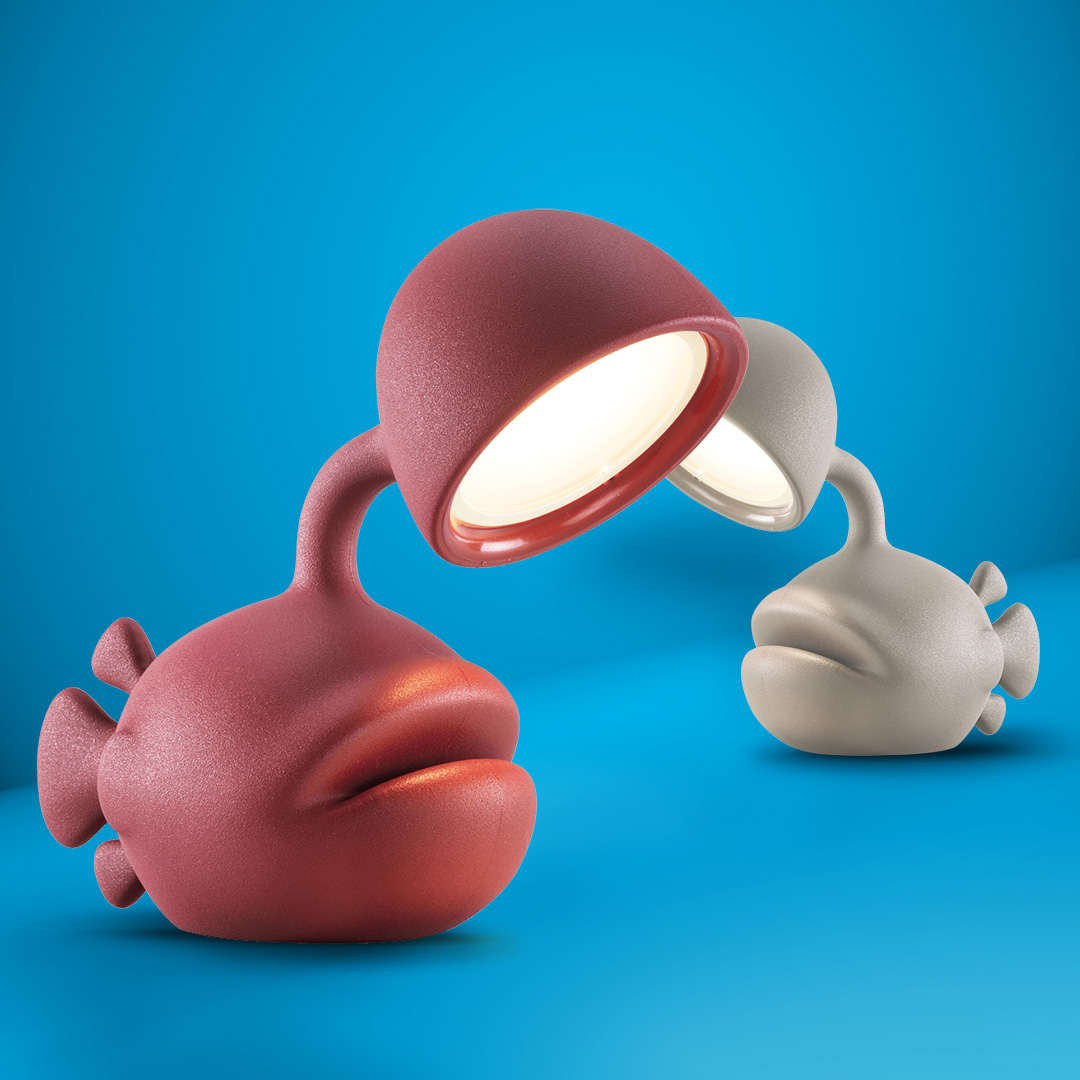 深海の暗闇でみずから光を灯す魚の生態を、そのまま部屋の中に持ち込んだ、彫刻的でユーモアあふれる照明です。