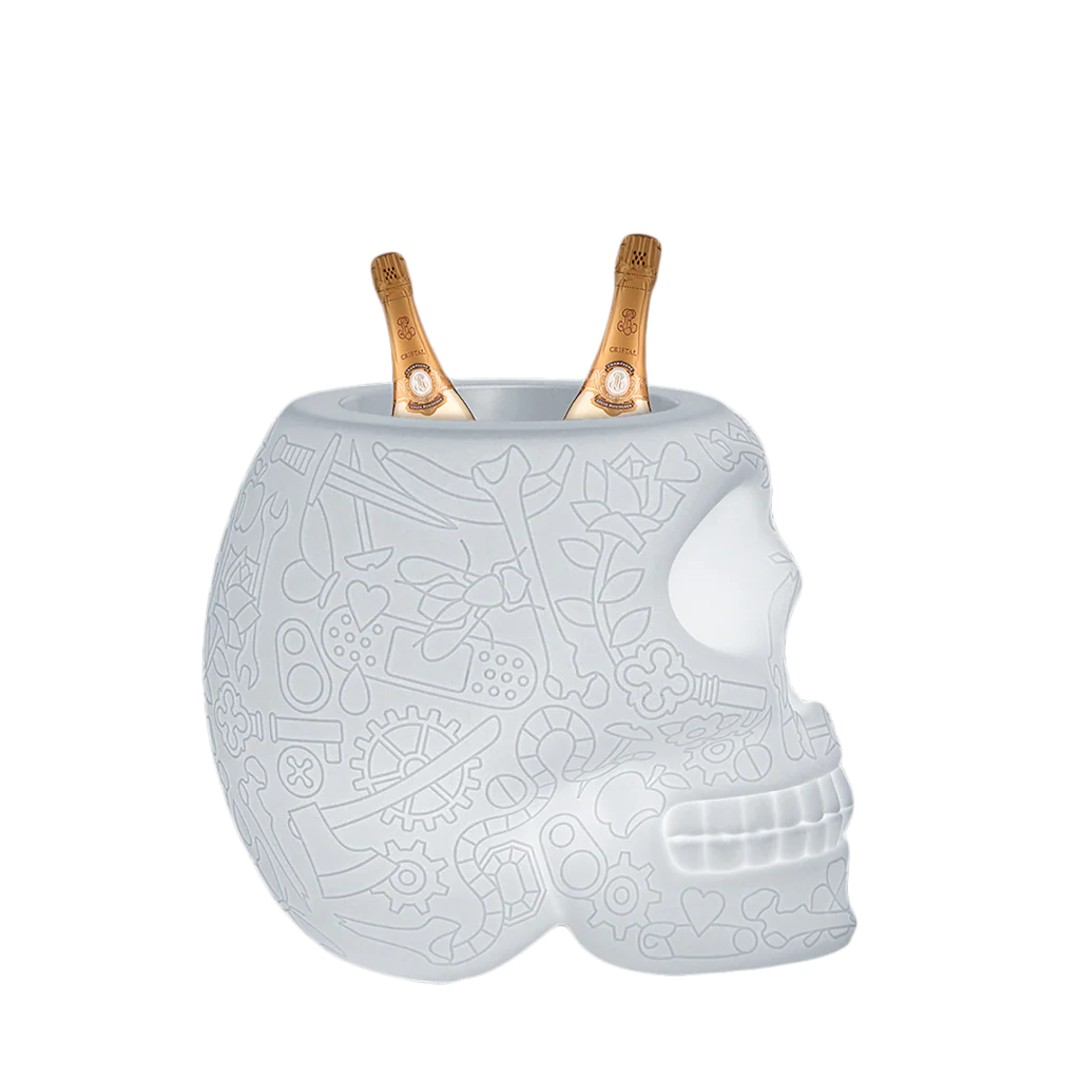 ひとつのドクロのかたちが、スツール・サイドテーブル・プランター・シャンパンクーラー・照明として機能する点が、このコレクション最大の個性です。