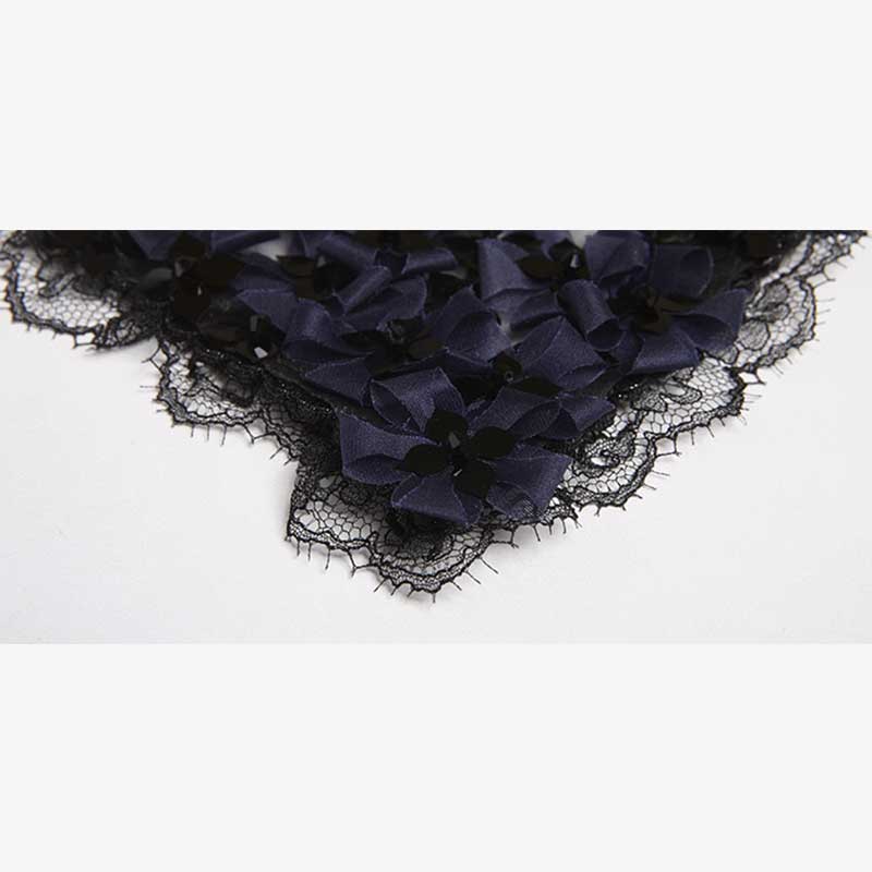 ネイビーブルーのオーガンザ布の小さなフラワーと黒パールが刺繍されたカフス:カレレースの縁取りで強調(アトリエ・ルサージュとのコラボレーション)