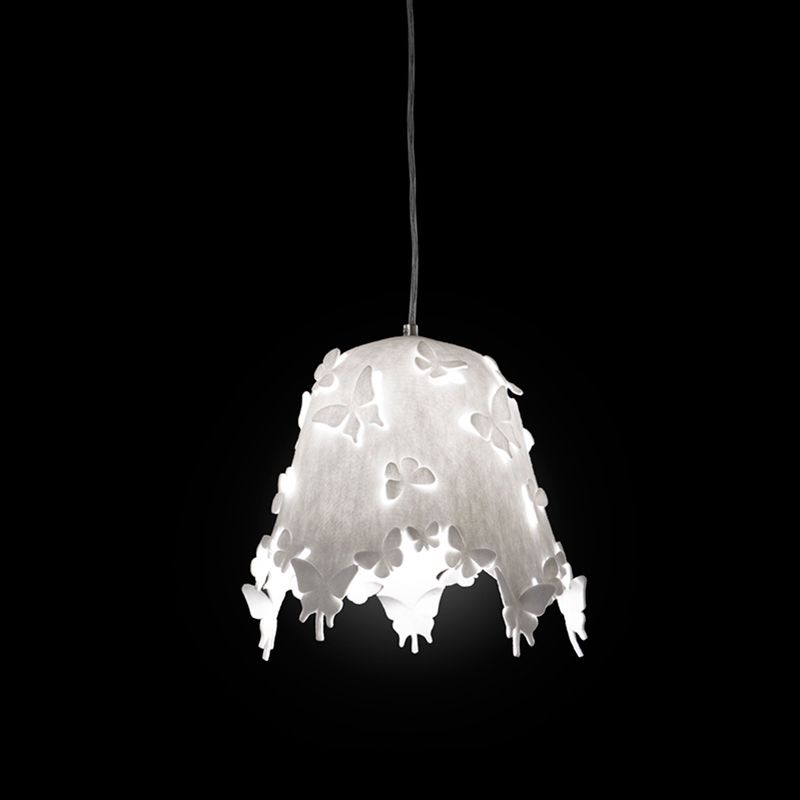 フエルトに型うちされた蝶のモチーフから洩れる明かりが、とても可愛らしく空間を演出します。蝶の型うちは、この照明を印象的にするばかりでなく、形状を立体的に見せる効果もあります。様々な空間にコーディネートしやすい、温かみを感じる照明です。