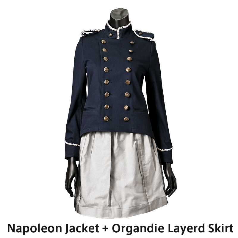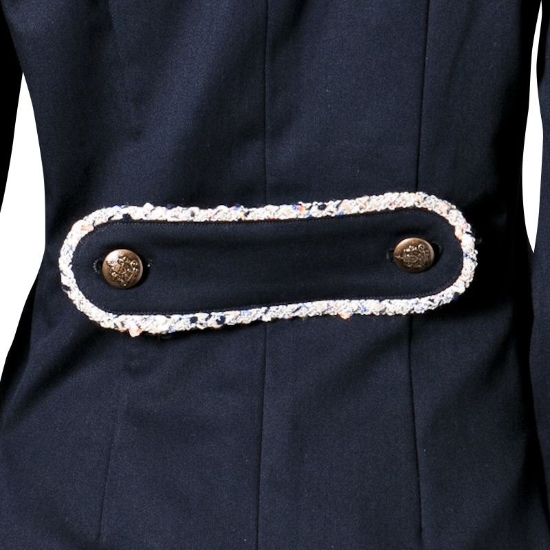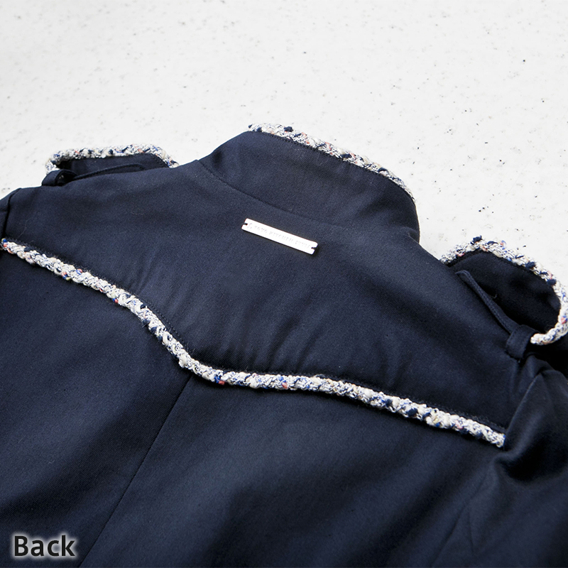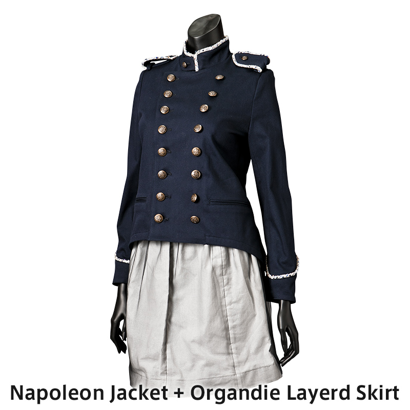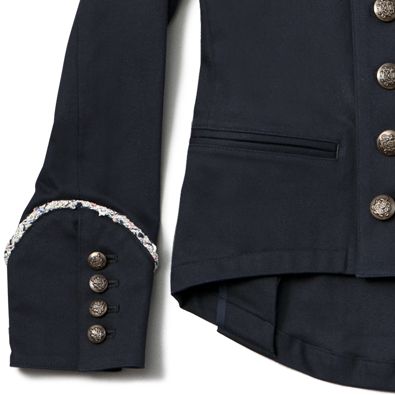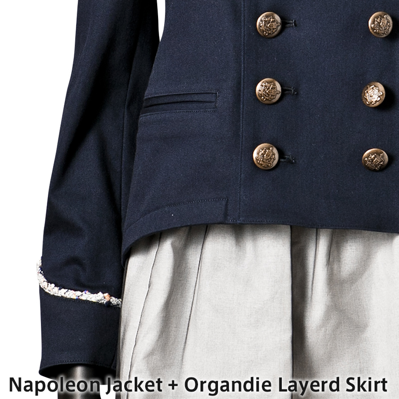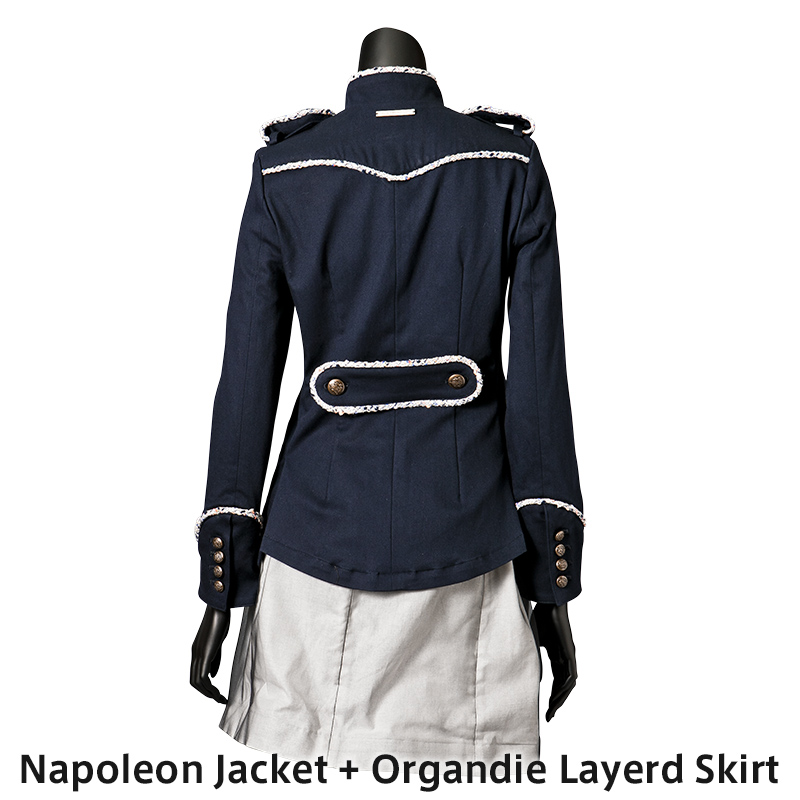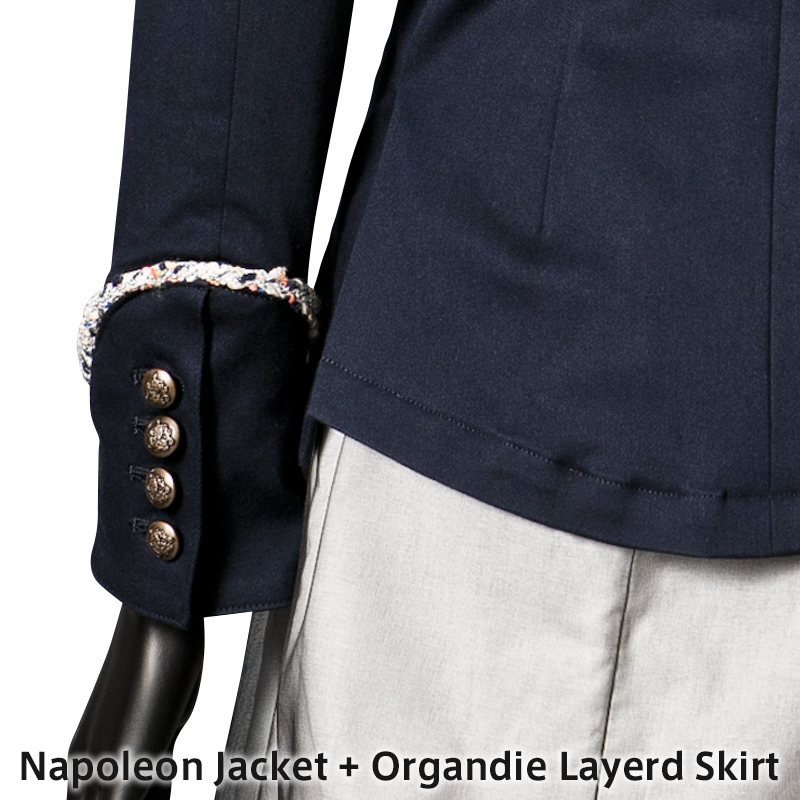 裾の前から後ろに向けて長くなっている燕尾服の仕様になっておりクラシックなセレモニージャケットスタイルのナポレオンジャケットです。タイトな仕立てになっておりますので、細身のパンツはもちろんボリュームのあるスカートなどとの相性も良いアイテムです。
