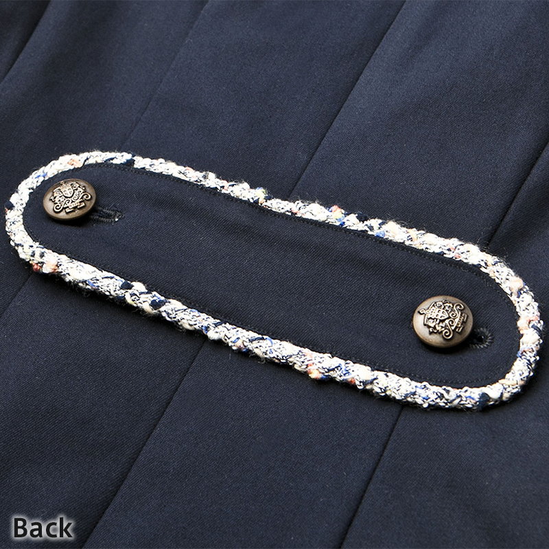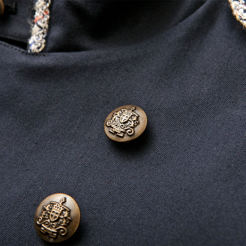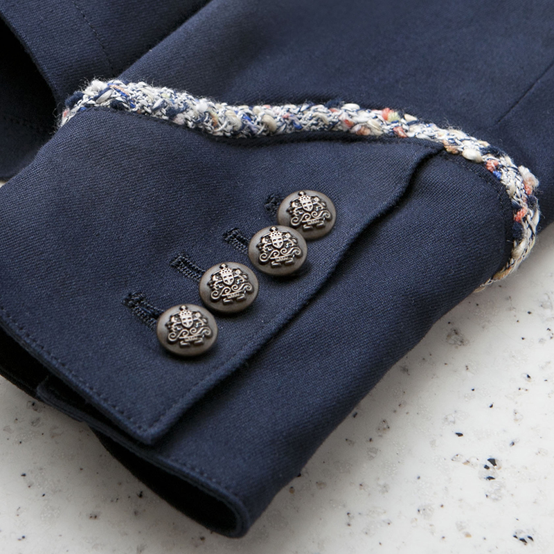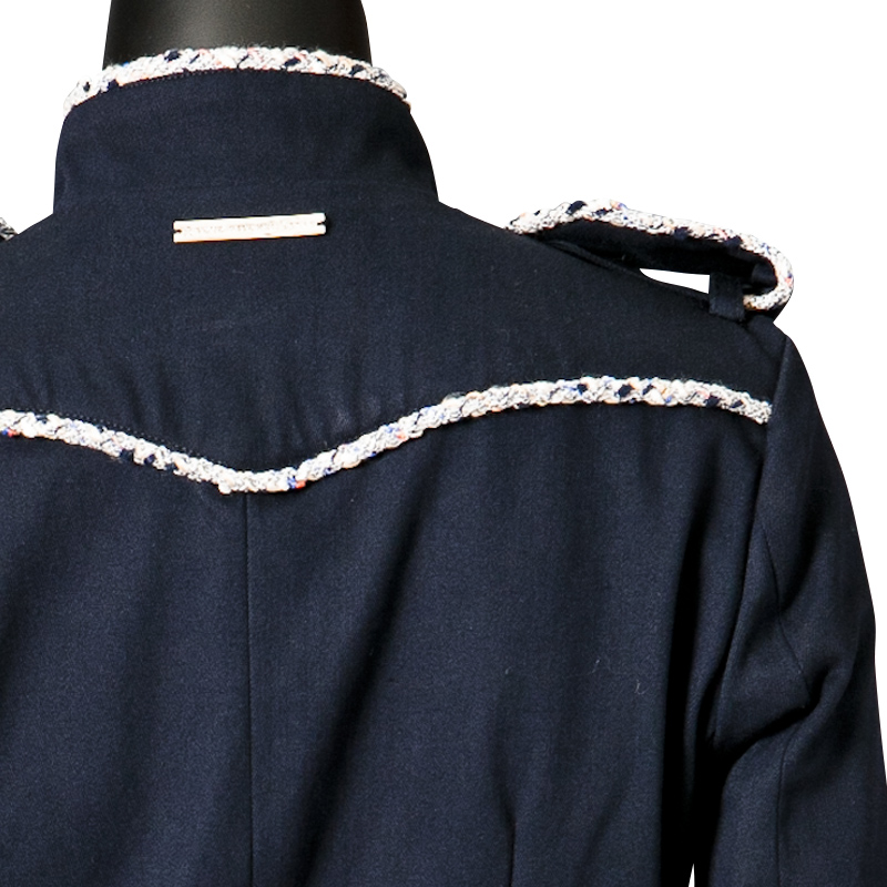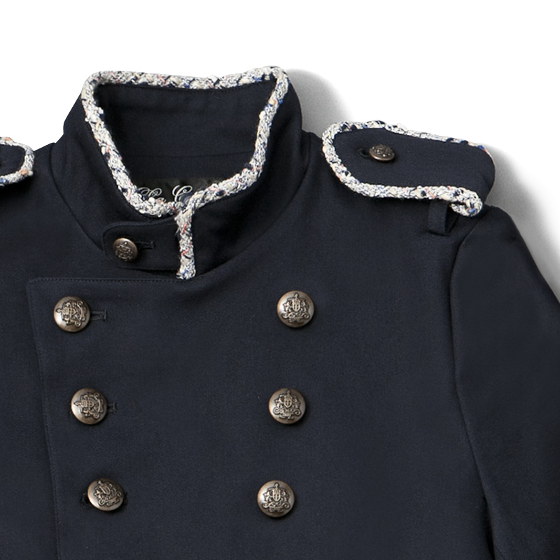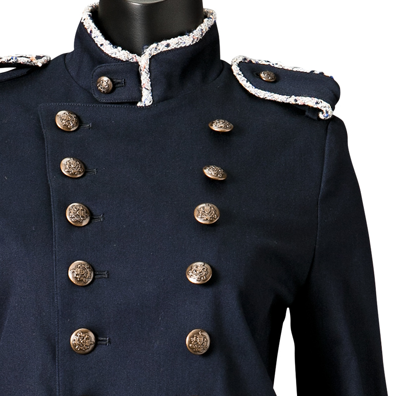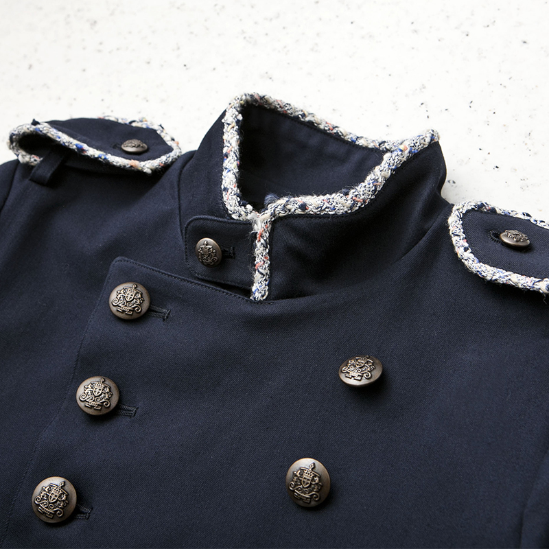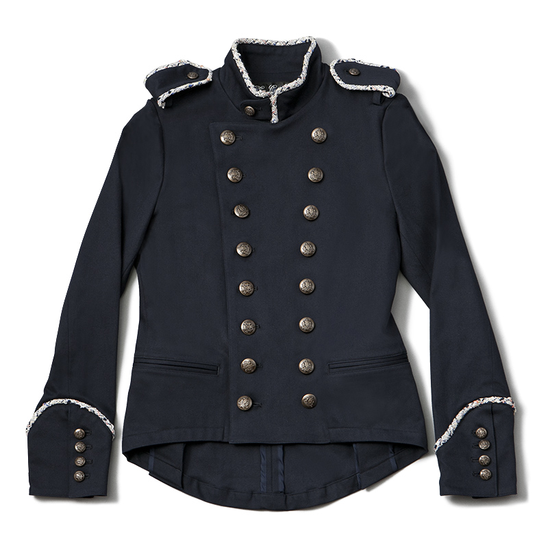裾の前から後ろに向けて長くなっている燕尾服の仕様になっておりクラシックなセレモニージャケットスタイルのナポレオンジャケットです。タイトな仕立てになっておりますので、細身のパンツはもちろんボリュームのあるスカートなどとの相性も良いアイテムです。