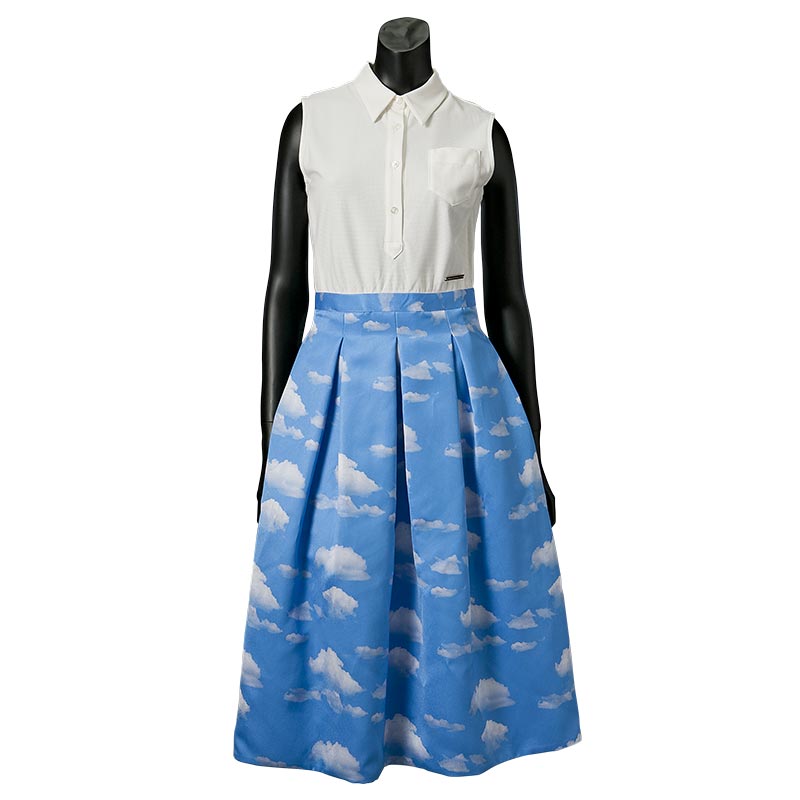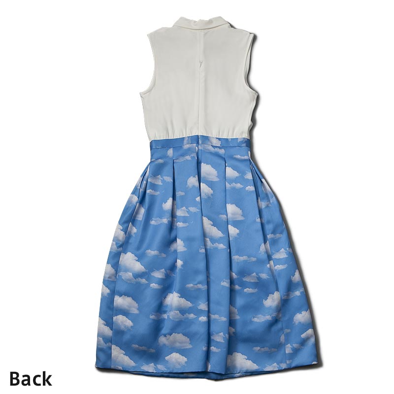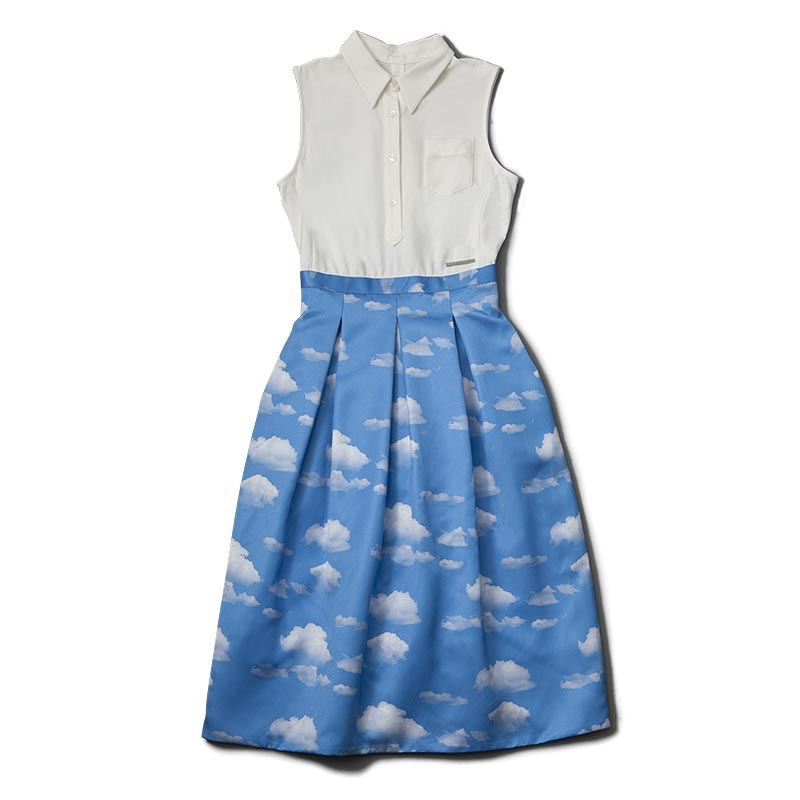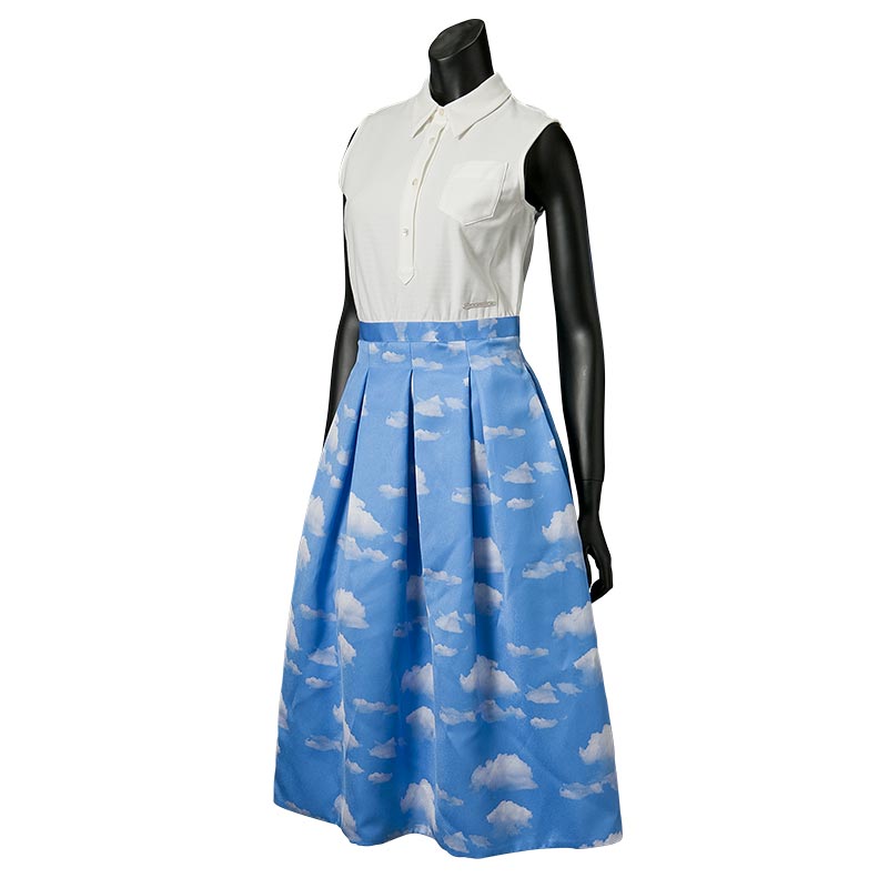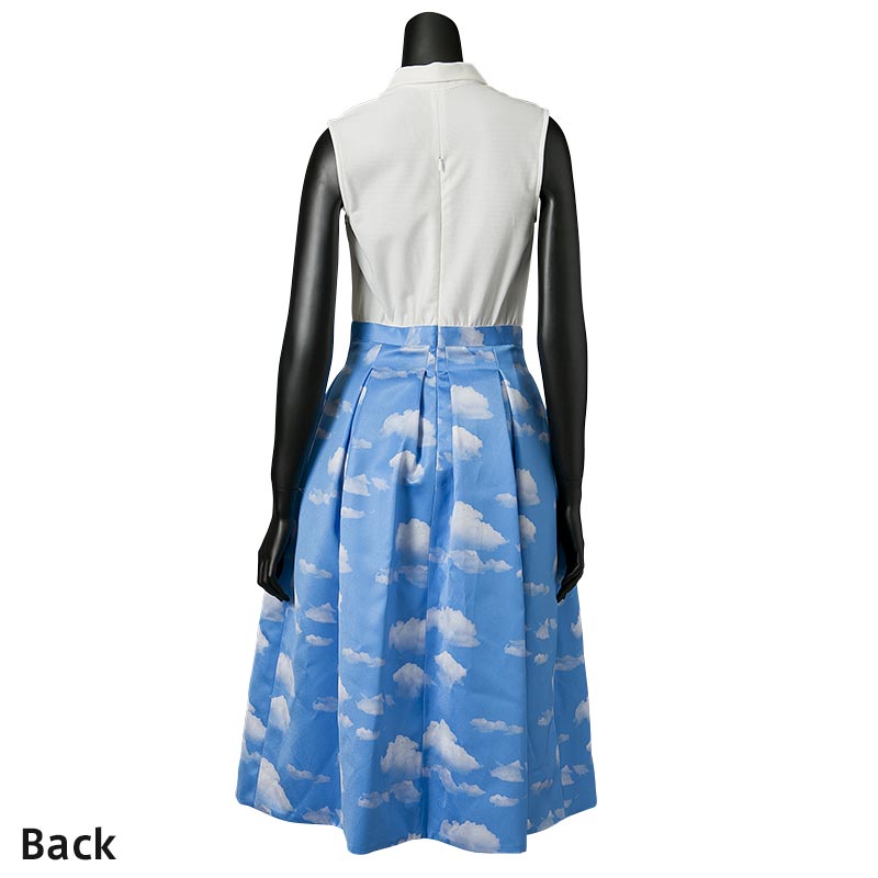 今シーズンのテーマである海辺のバカンスを思わせる1着です。コートダジュールの碧い空を切り取って雲の上にいるような気分にさせてくれる1着です。スカート部分はバルーンシルエットになっておりボリューム感が特長です。