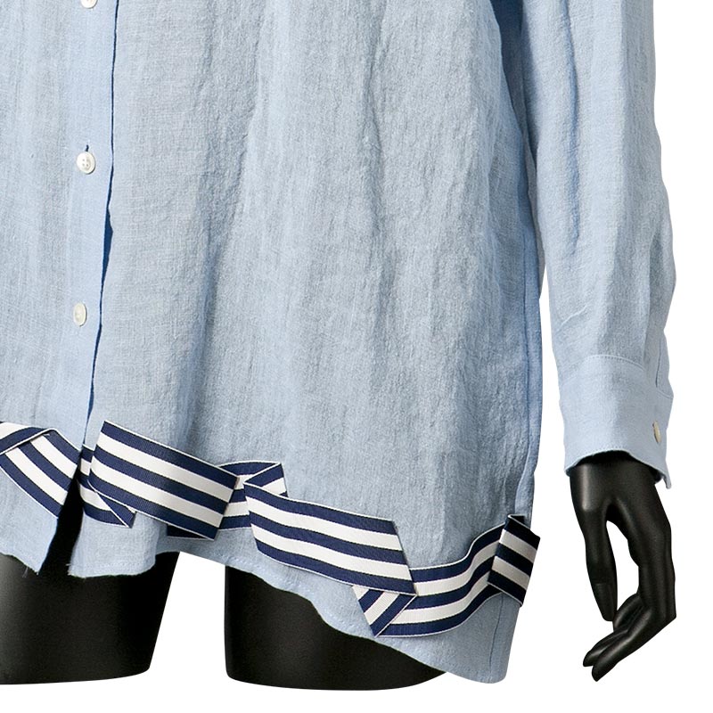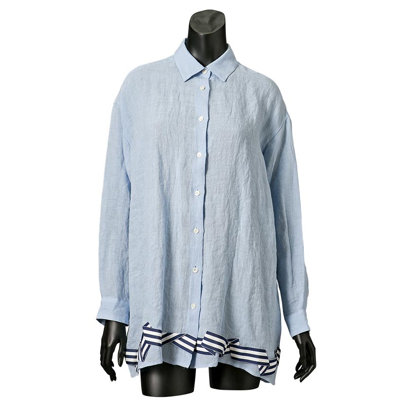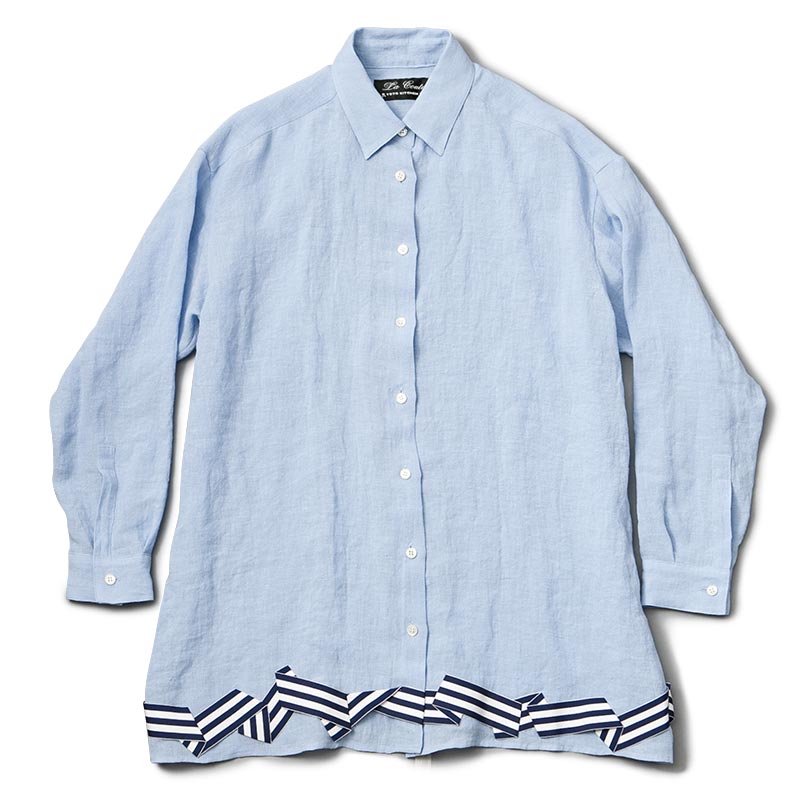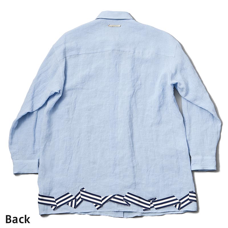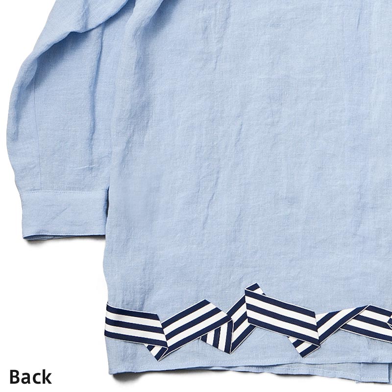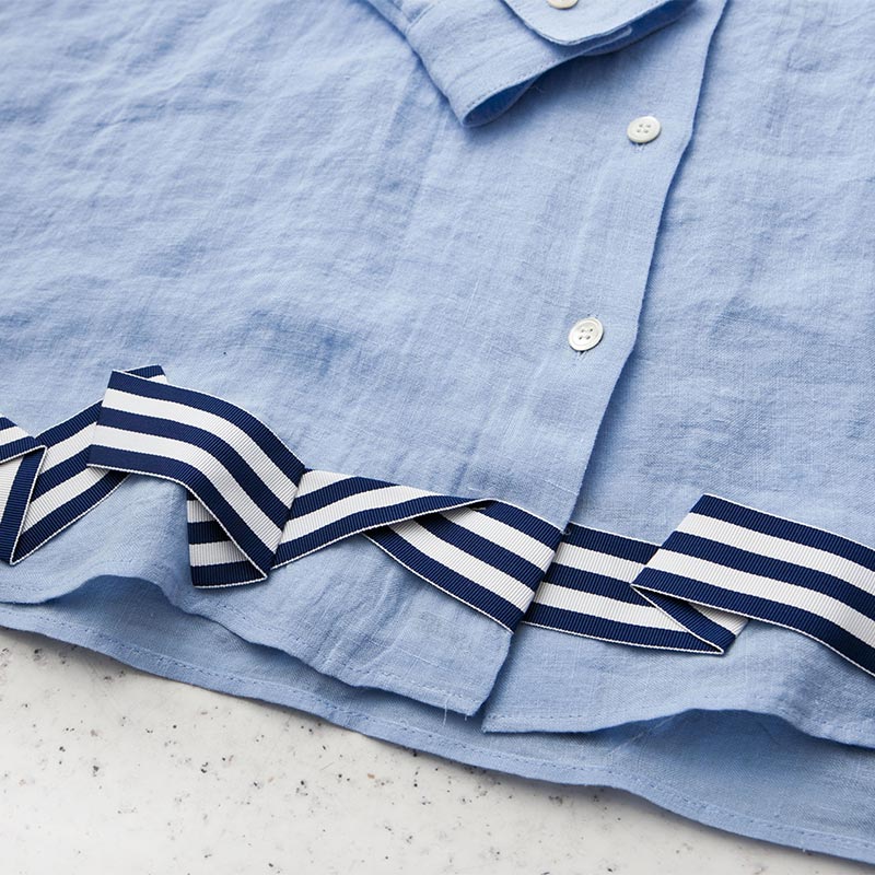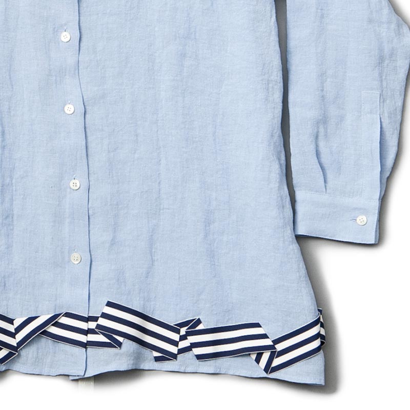 水着の上に1枚で羽織るイメージで制作したリネンシャツです。オーバーサイズでゆったりとしたシルエットでワンピースとしての着用がピッタリです。裾にあしらったボーダー柄のリボンが南仏の雰囲気を醸し出しています。