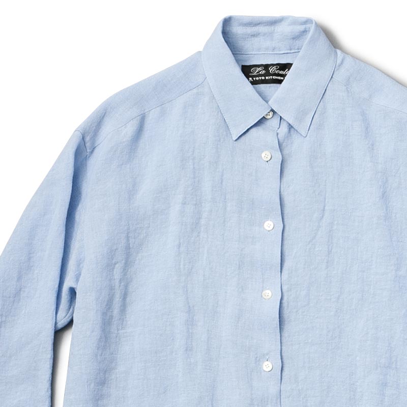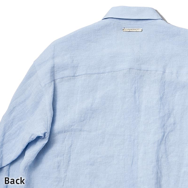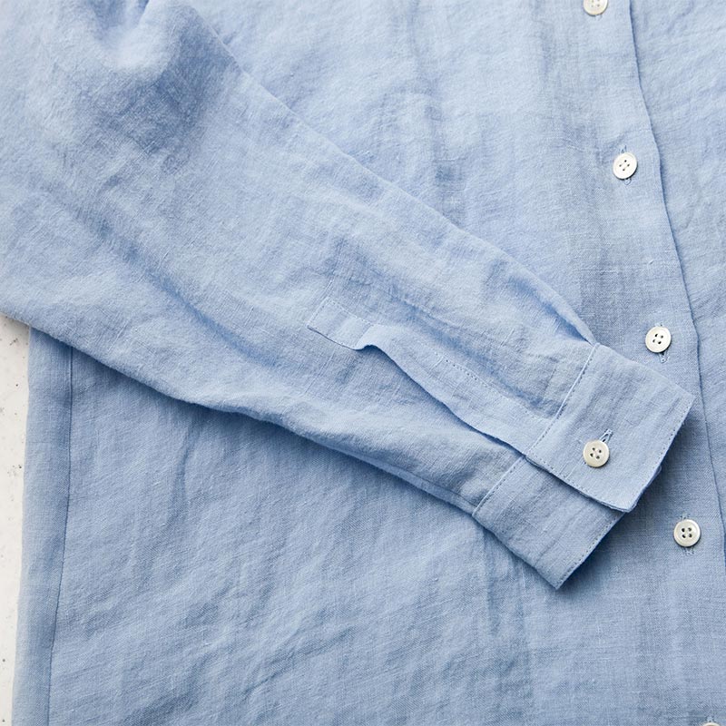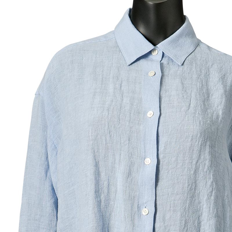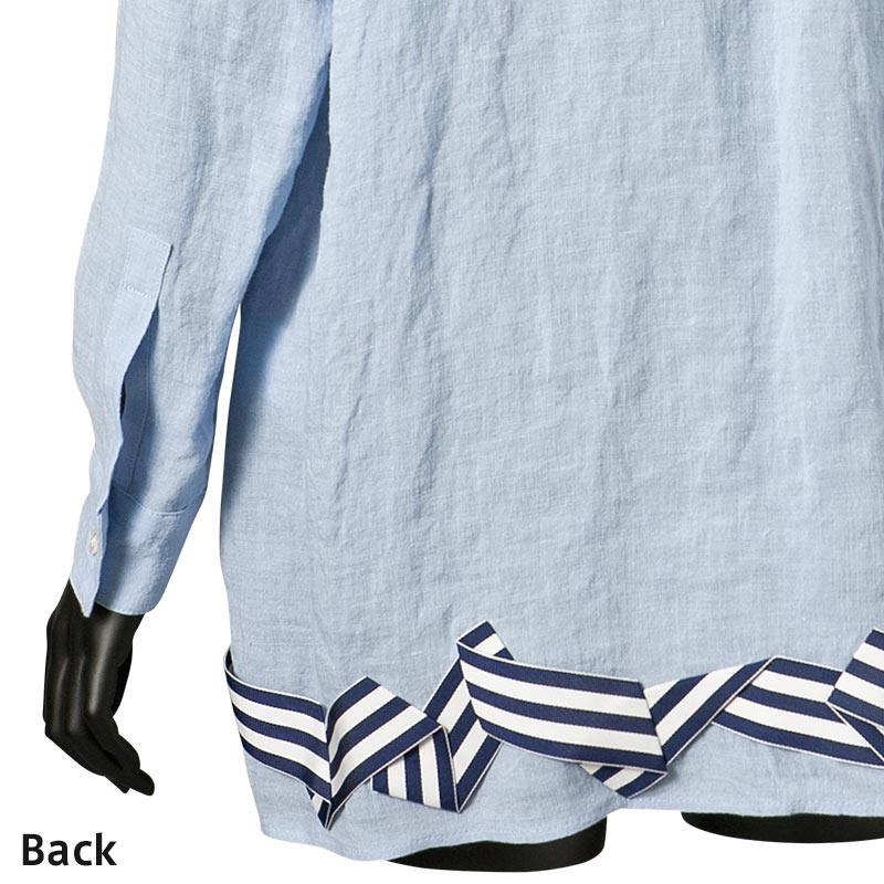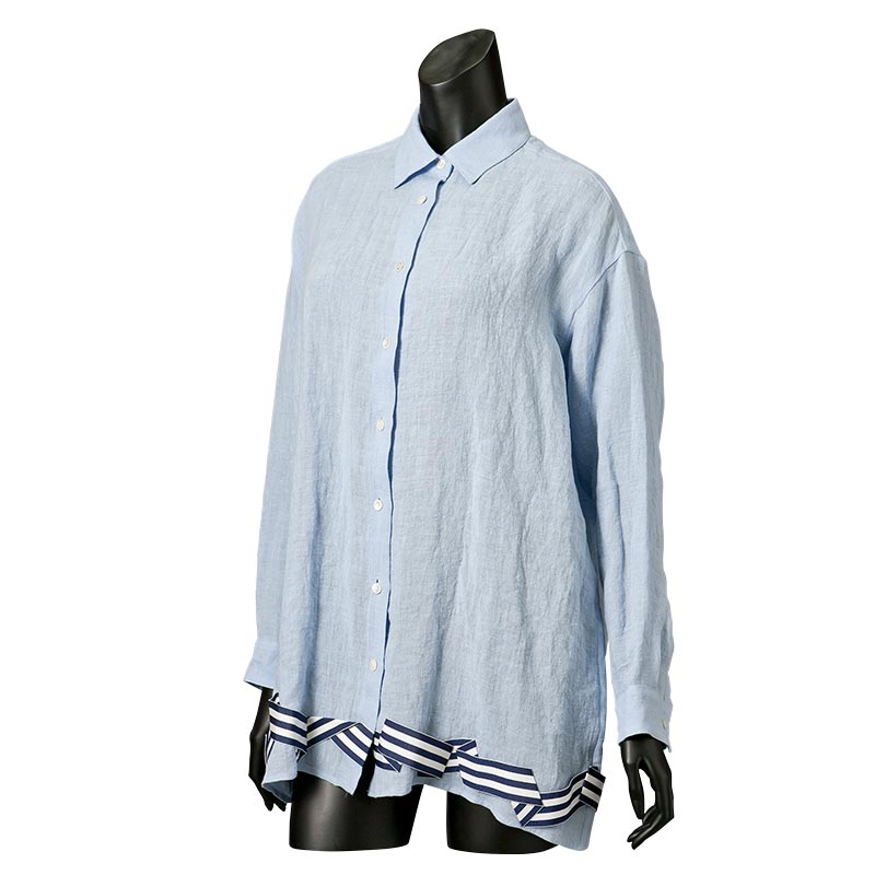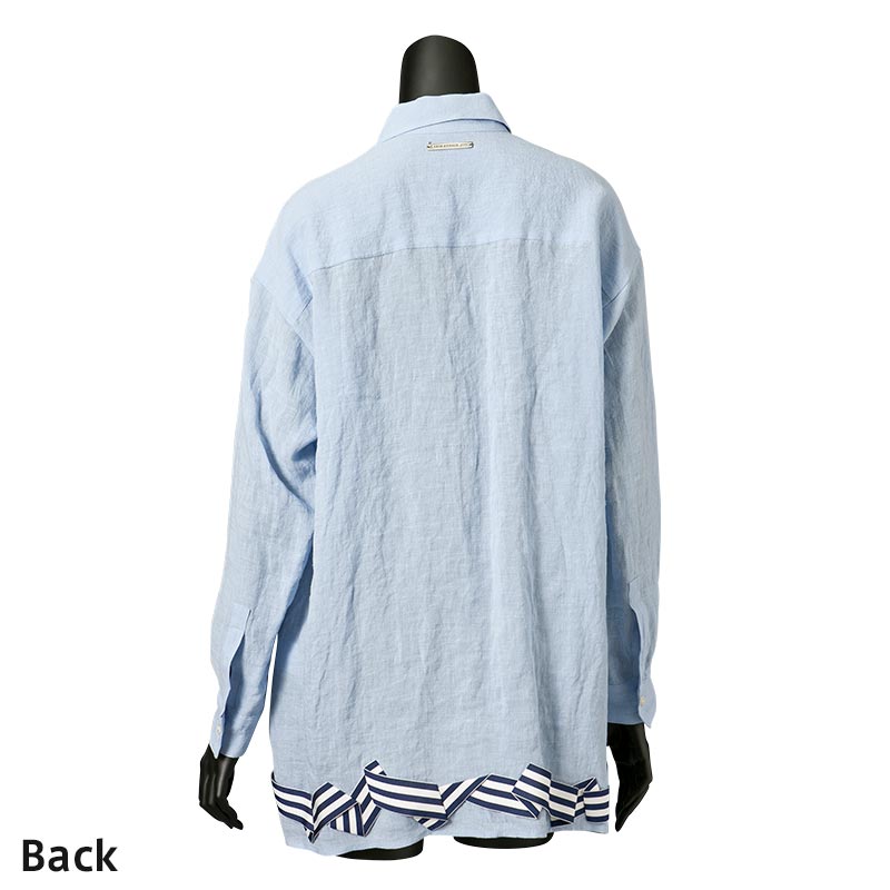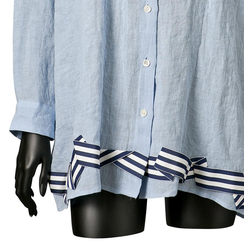 水着の上に1枚で羽織るイメージで制作したリネンシャツです。オーバーサイズでゆったりとしたシルエットでワンピースとしての着用がピッタリです。裾にあしらったボーダー柄のリボンが南仏の雰囲気を醸し出しています。