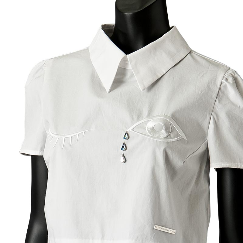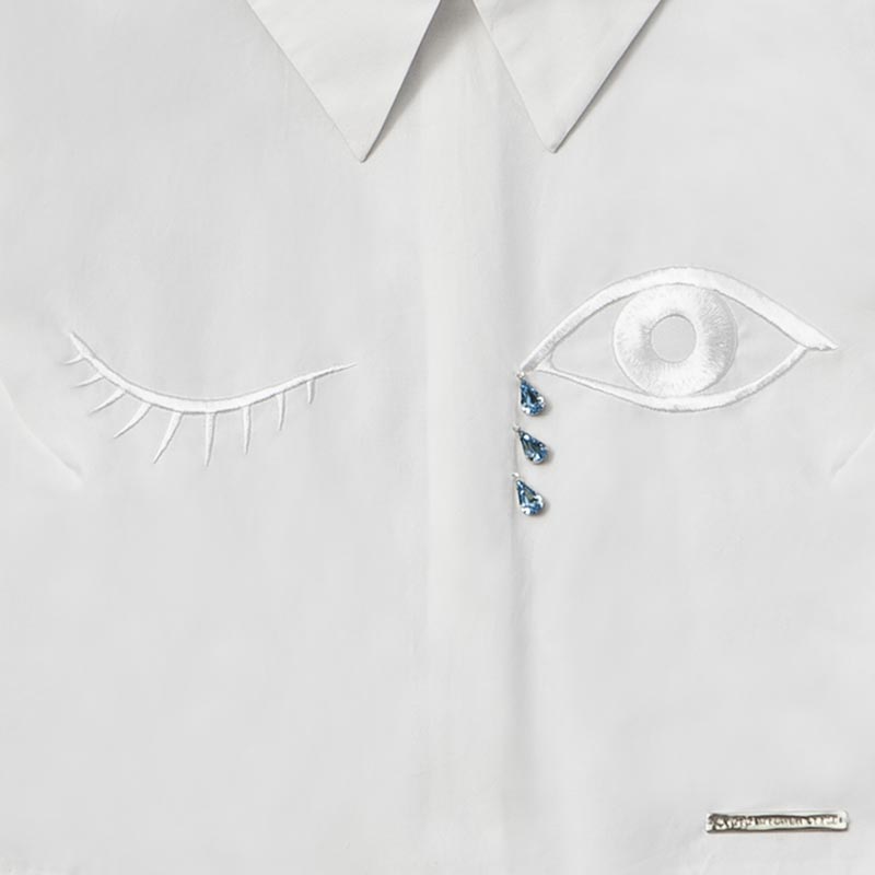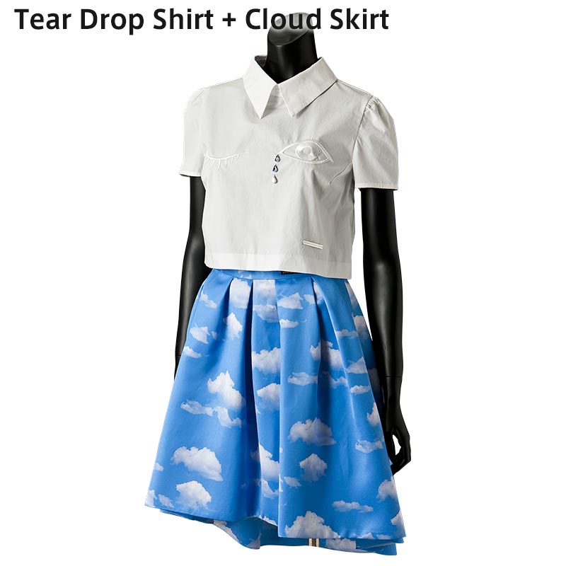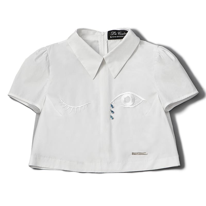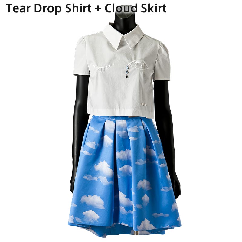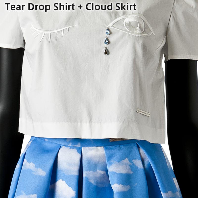 今季を象徴するグラフィックアイテムです。ウインクしている図柄に刺繍が施されスワロの涙が3粒というなんとも気になるデザインです。パフスリーブに短めの着丈がキュートな印象。