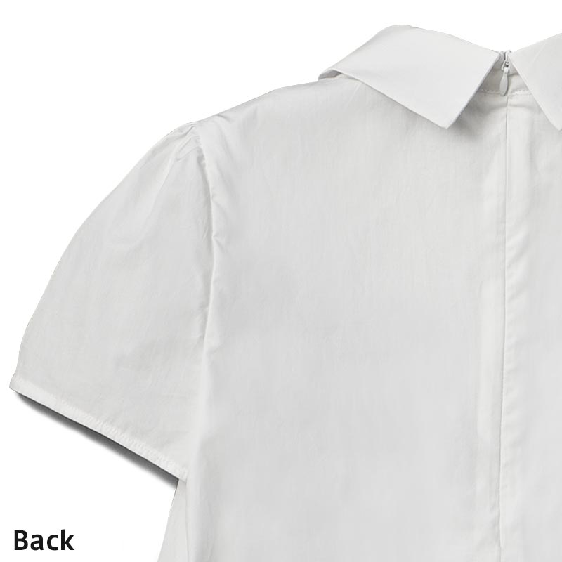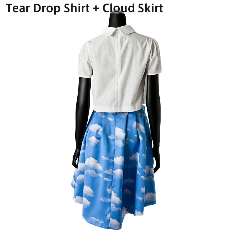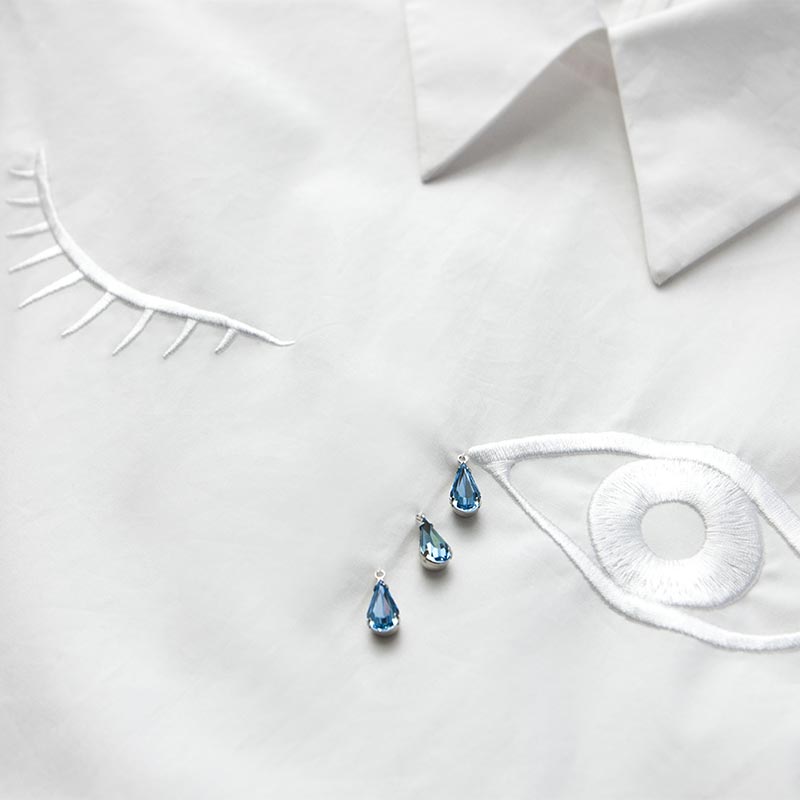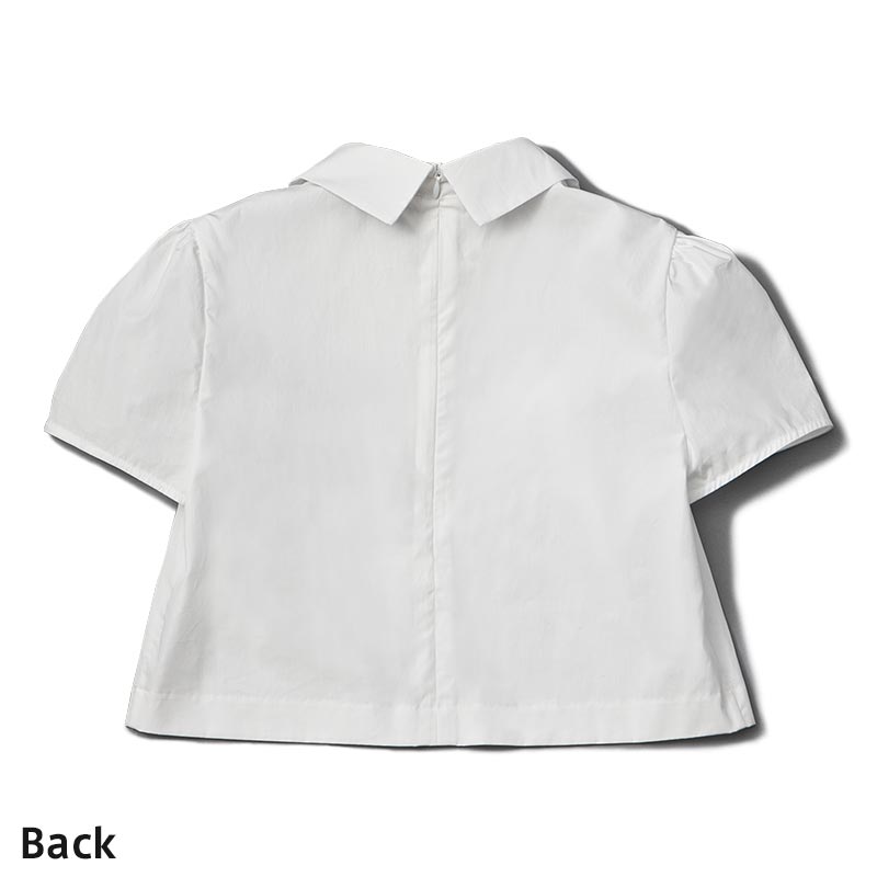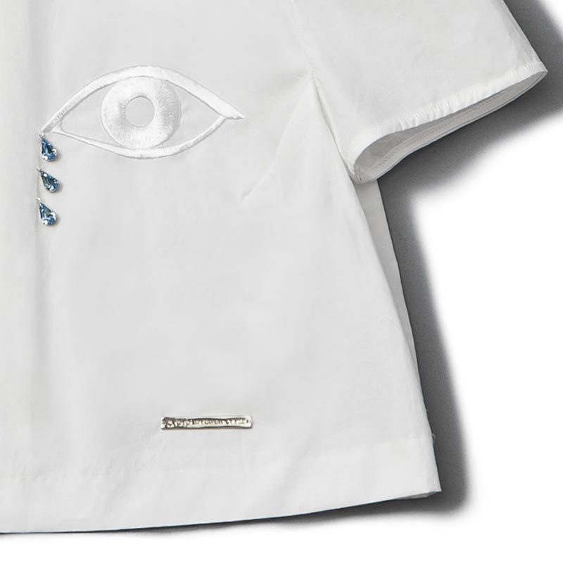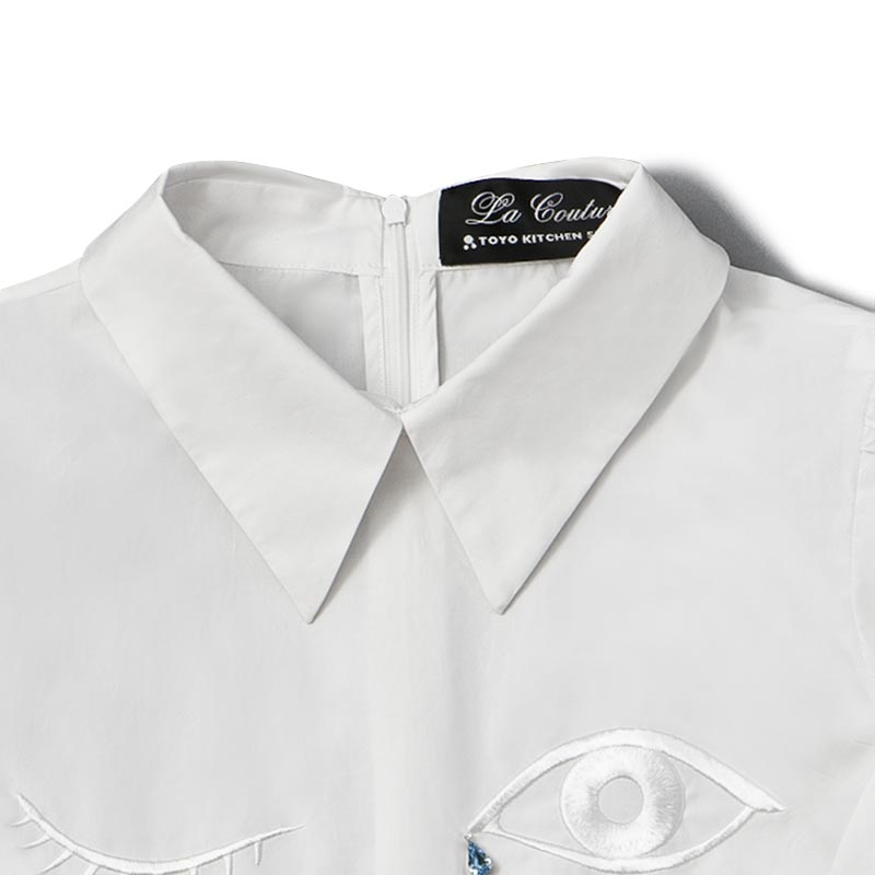 今季を象徴するグラフィックアイテムです。ウインクしている図柄に刺繍が施されスワロの涙が3粒というなんとも気になるデザインです。パフスリーブに短めの着丈がキュートな印象。