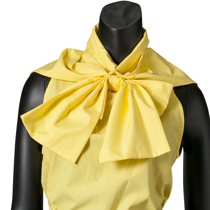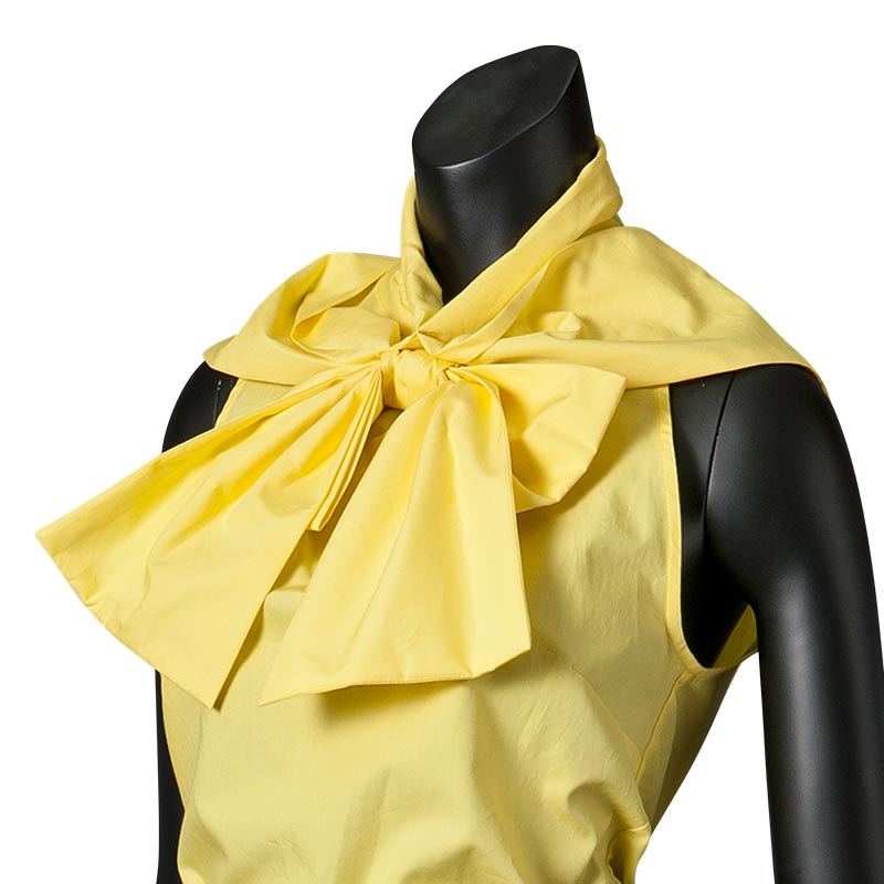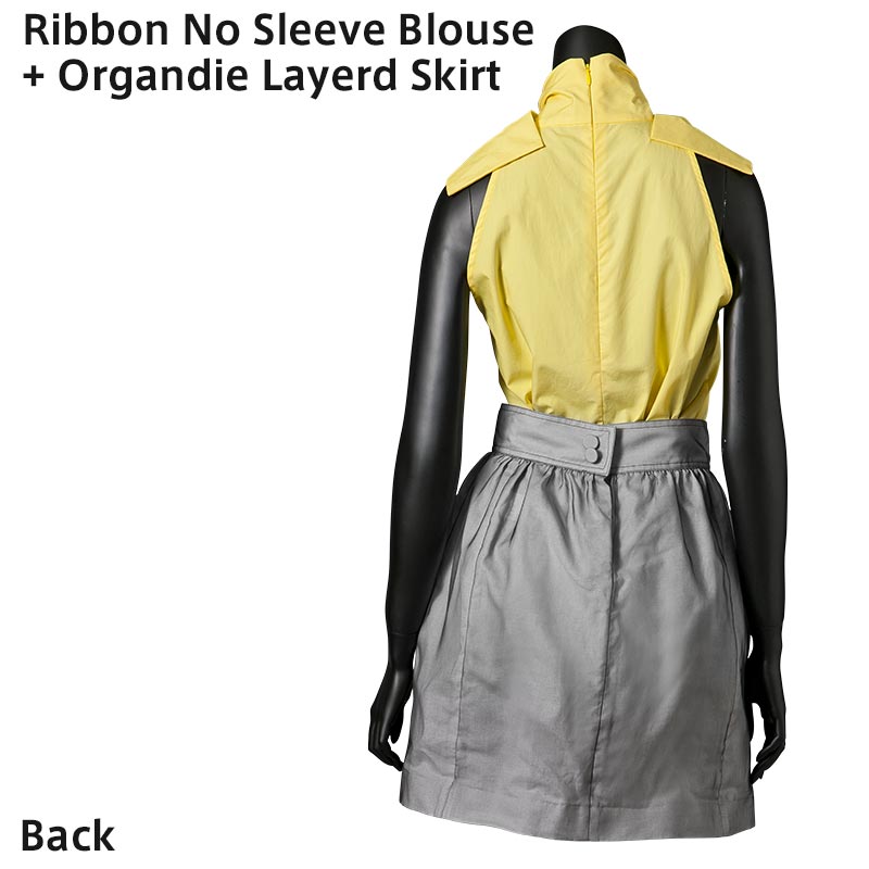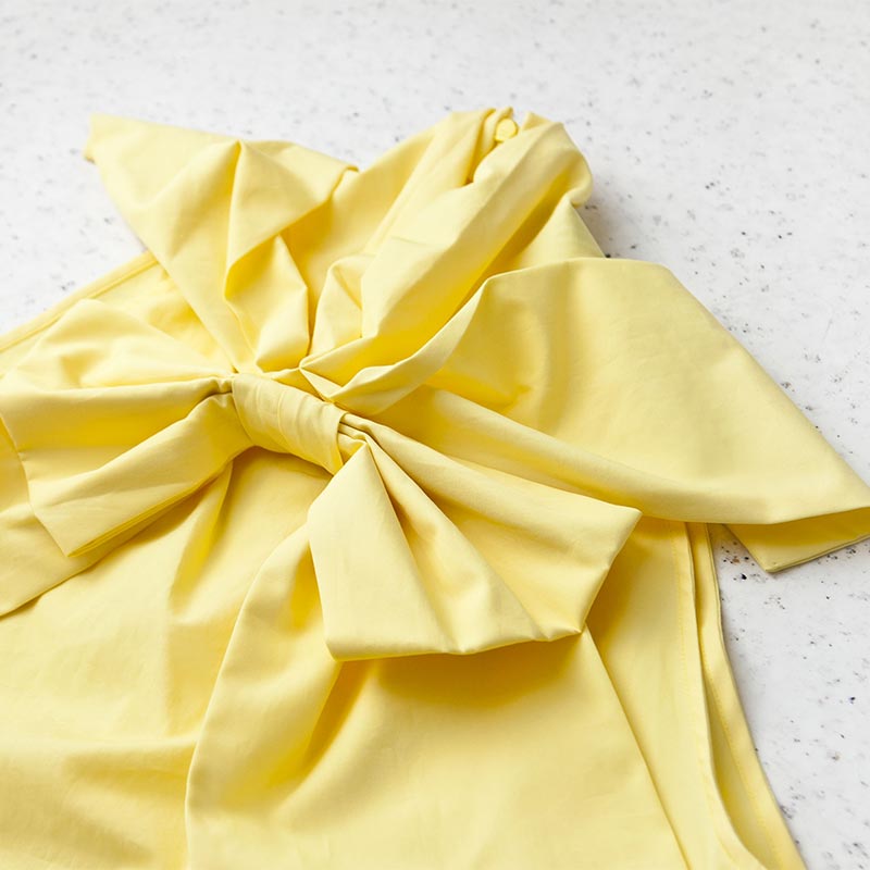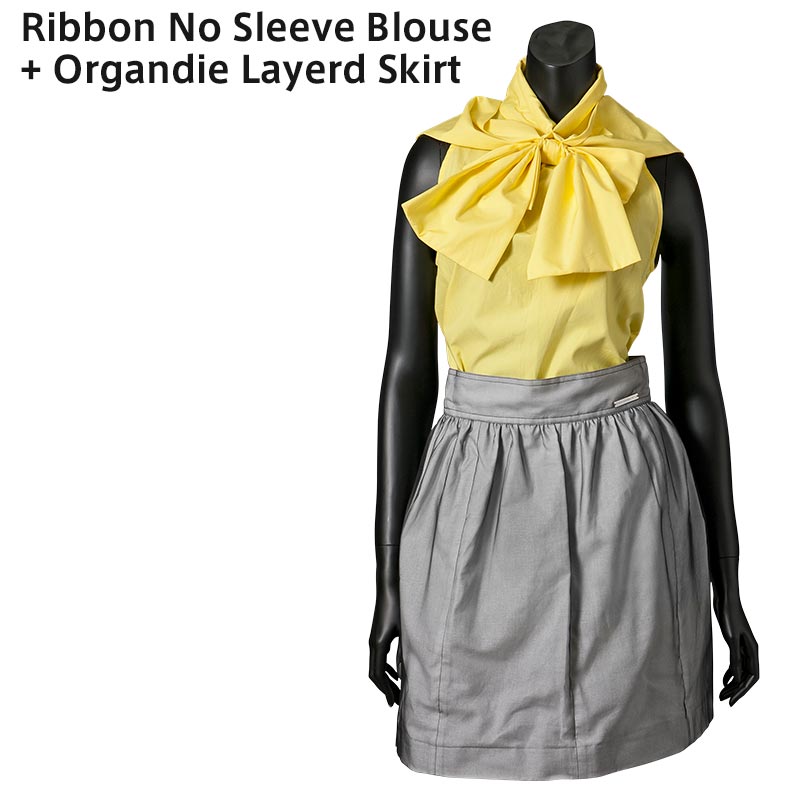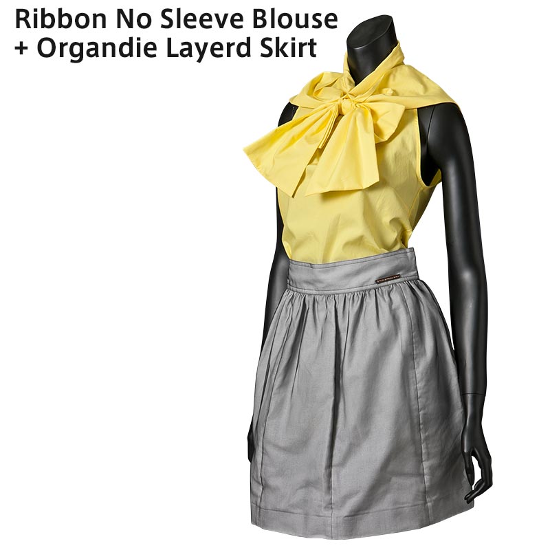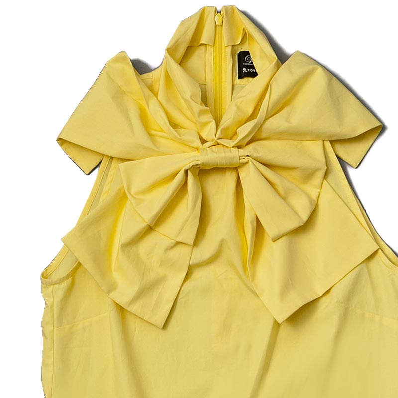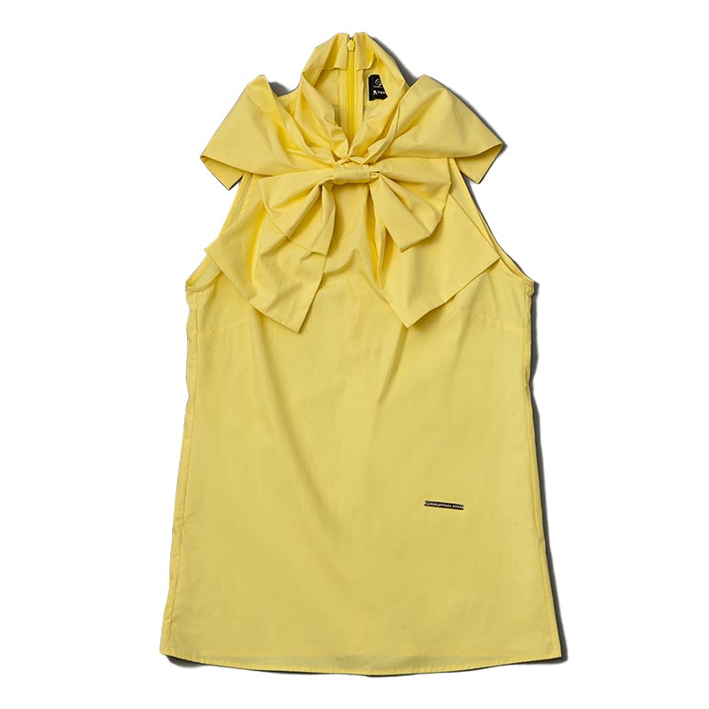大きなリボンを印象的にあしらったシャツ生地のノースリーブブラウスです。生地は最高級と言われるエジプト綿を使用。ショートパンツやスカートなど多くの組み合わせのアレンジでお楽しみください。