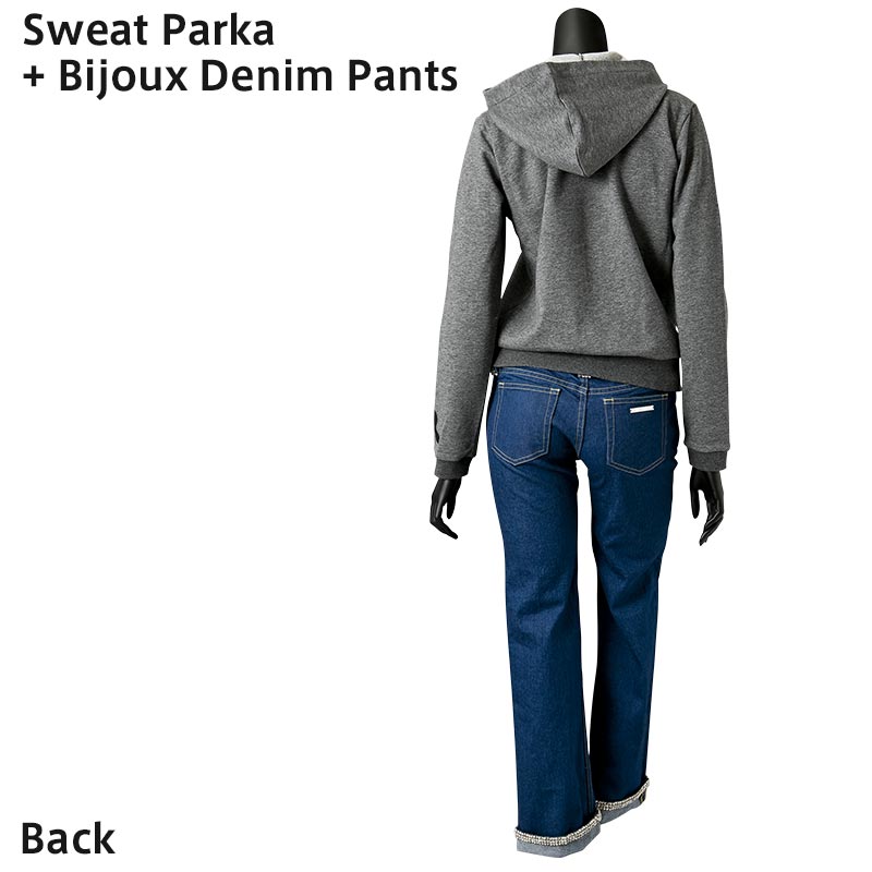 襟元のトランプのマークのスパンコールがファンタジーな世界観のスウェットパーカです。左袖にトーヨーキッチンのワッペンロゴが入っています。