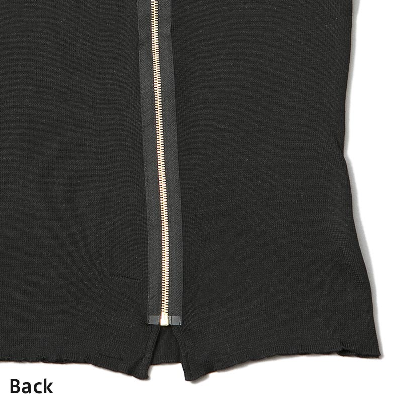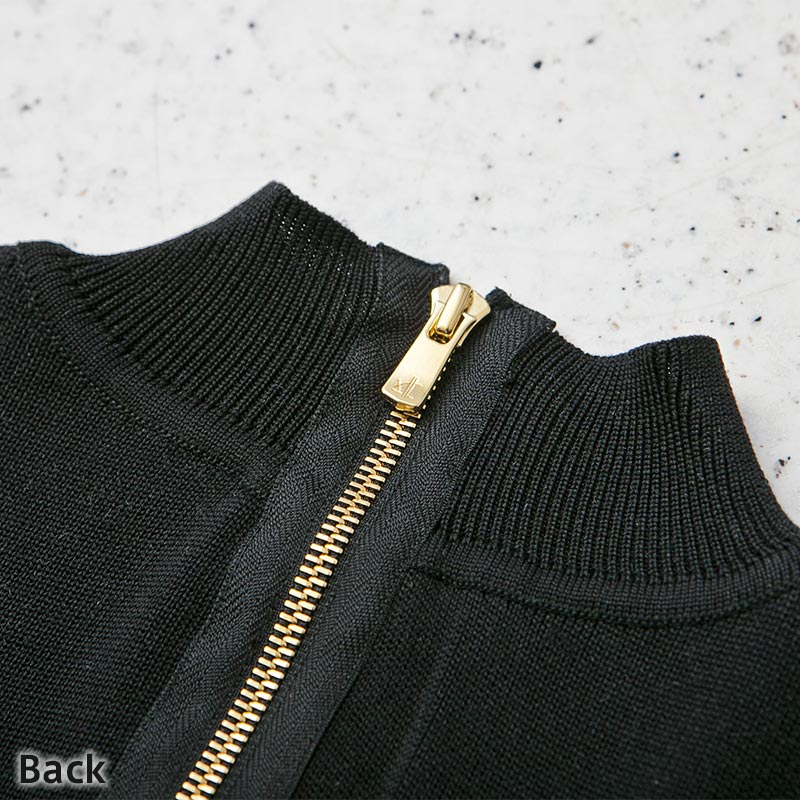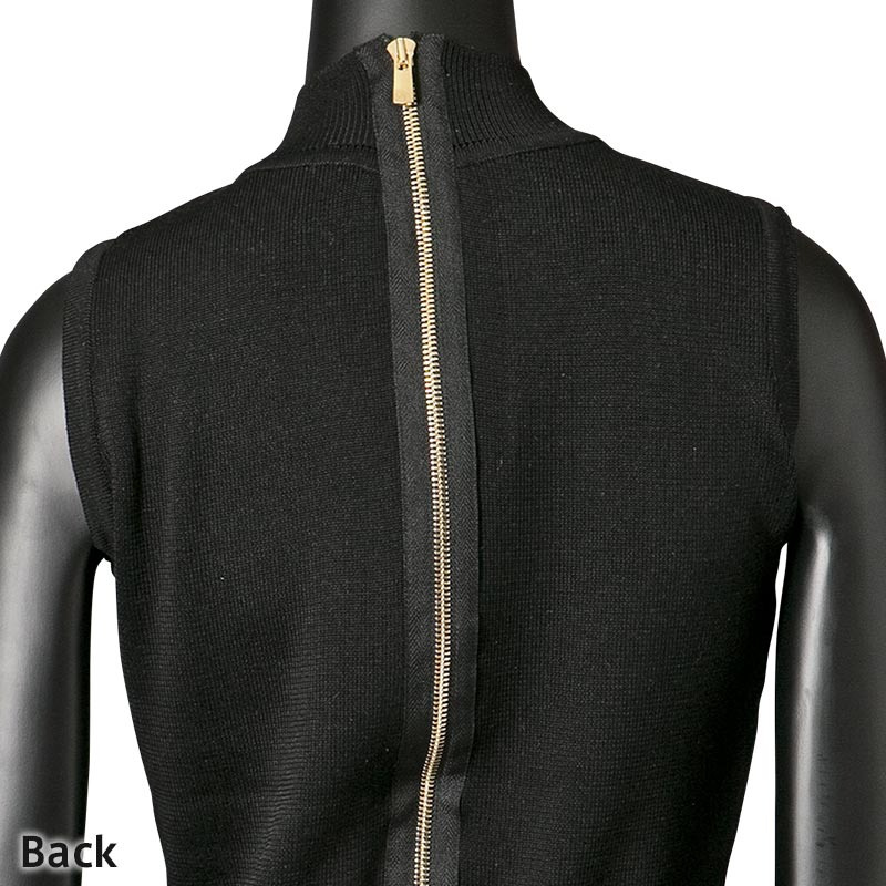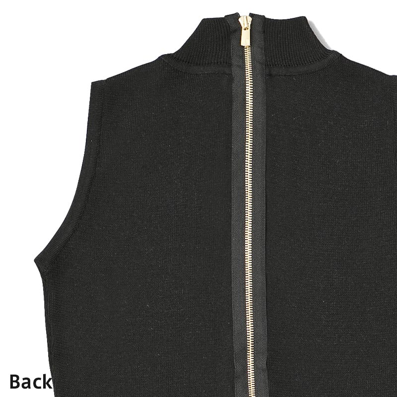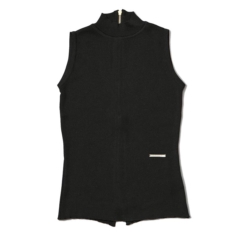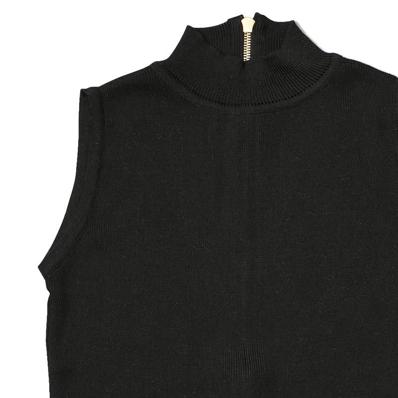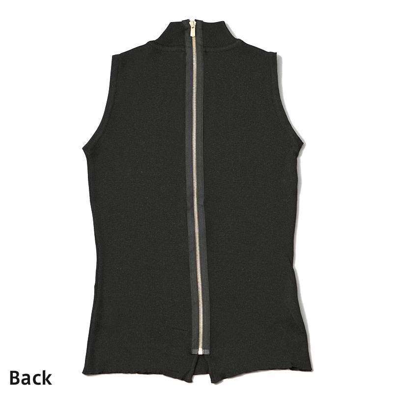 100%シルクの糸を贅沢に使用したハイネックノースリーブニットです。ファスナーテープを見せることで背中の印象をクールに引き立てています。
