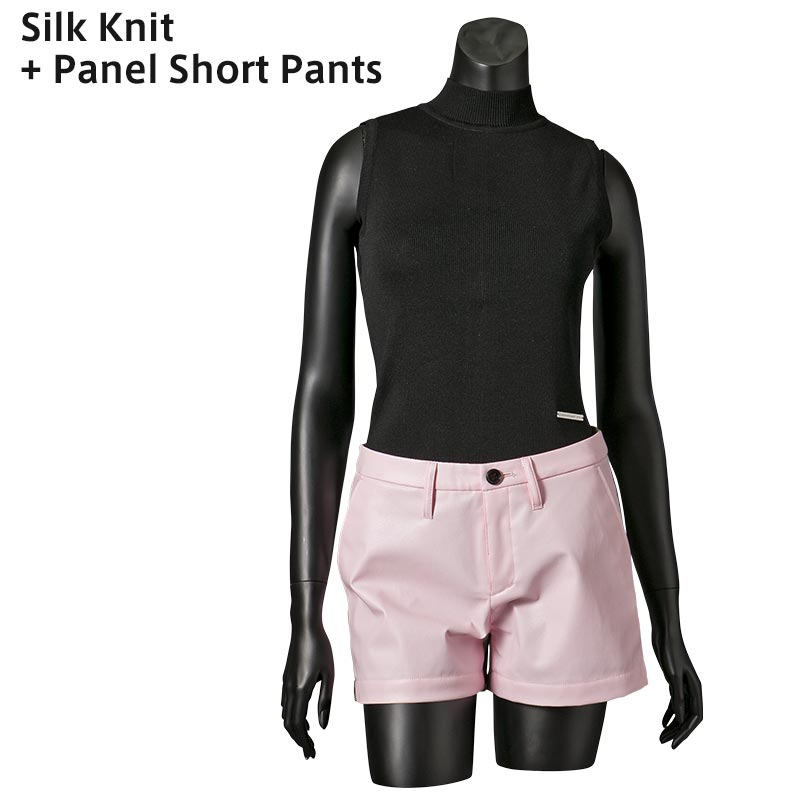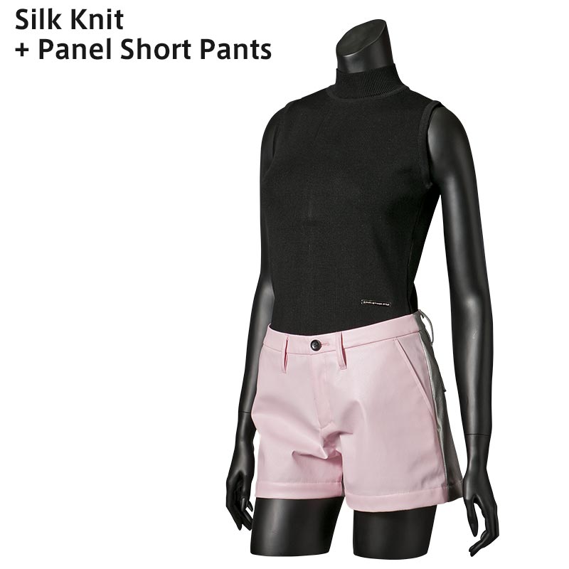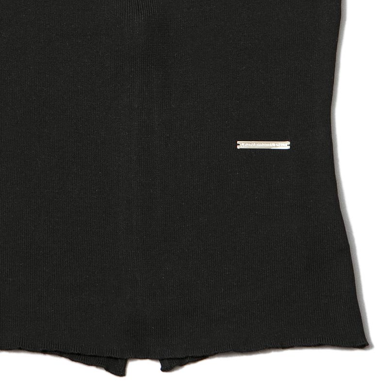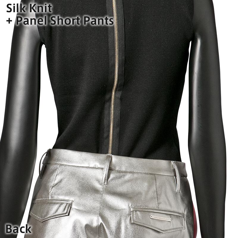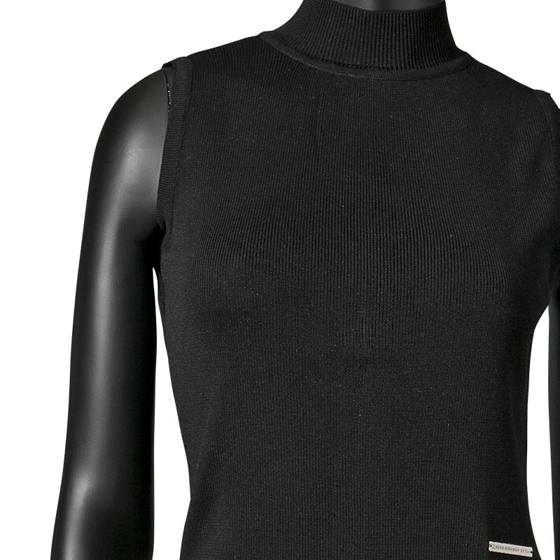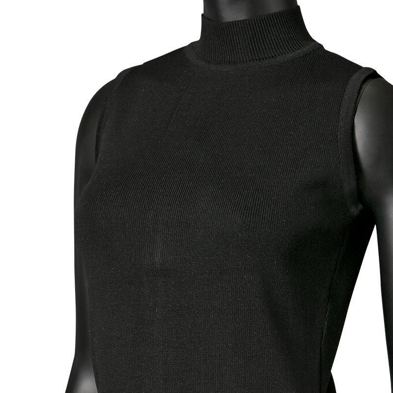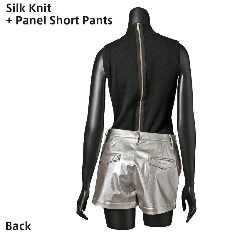 100%シルクの糸を贅沢に使用したハイネックノースリーブニットです。ファスナーテープを見せることで背中の印象をクールに引き立てています。