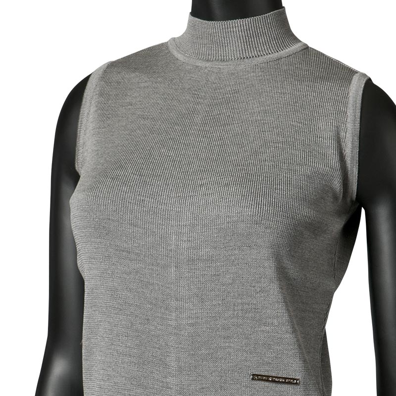100%シルクの糸を贅沢に使用したハイネックノースリーブニットです。ファスナーテープを見せることで背中の印象をクールに引き立てています。