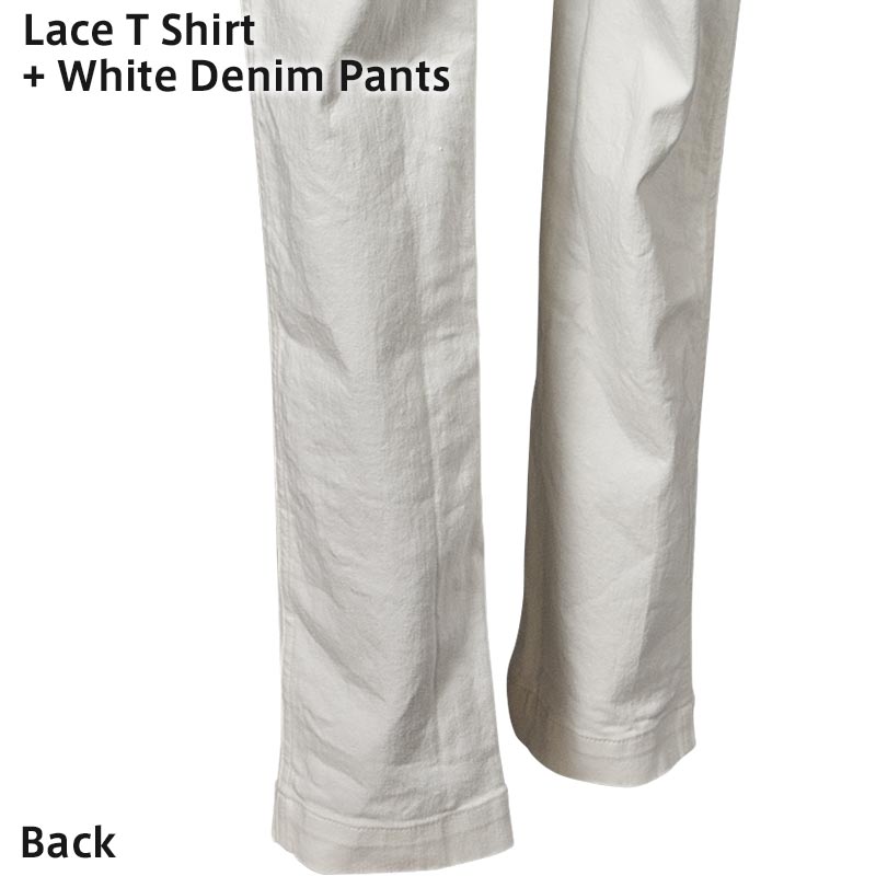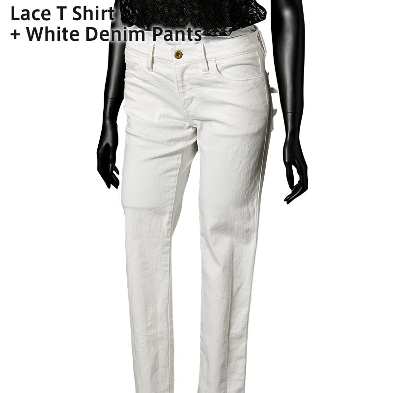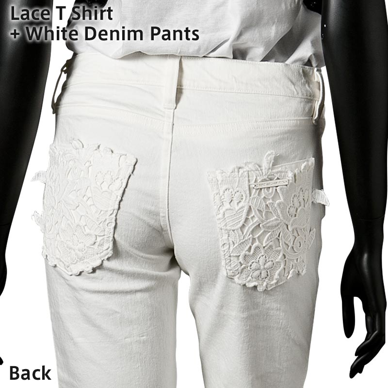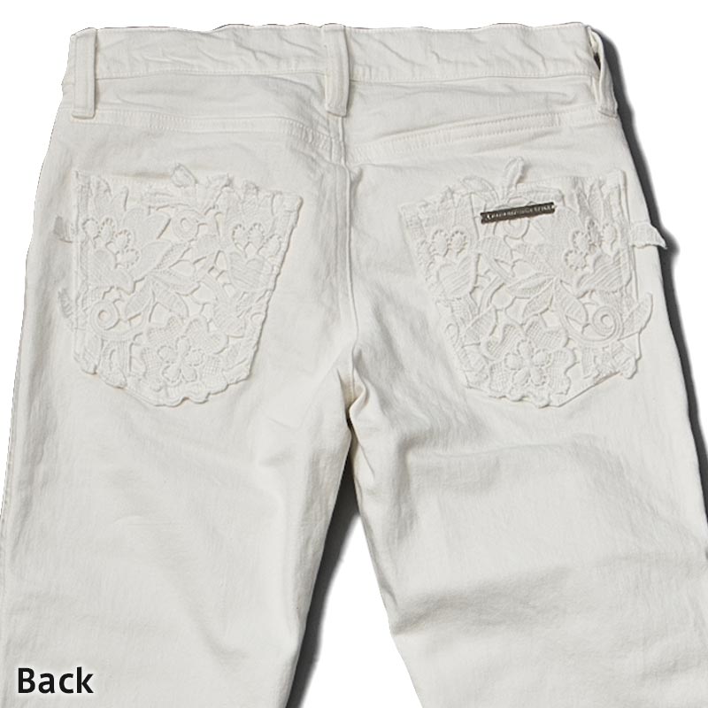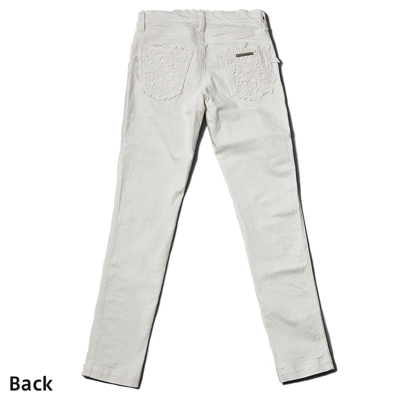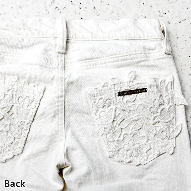 ホワイトスキニーデニムのヒップポケットに大柄のレースをあえてラフに重ねアクセントになっているパンツです。ホワイトジーンズは夏のコーディネートには欠かせない必須アイテムです。