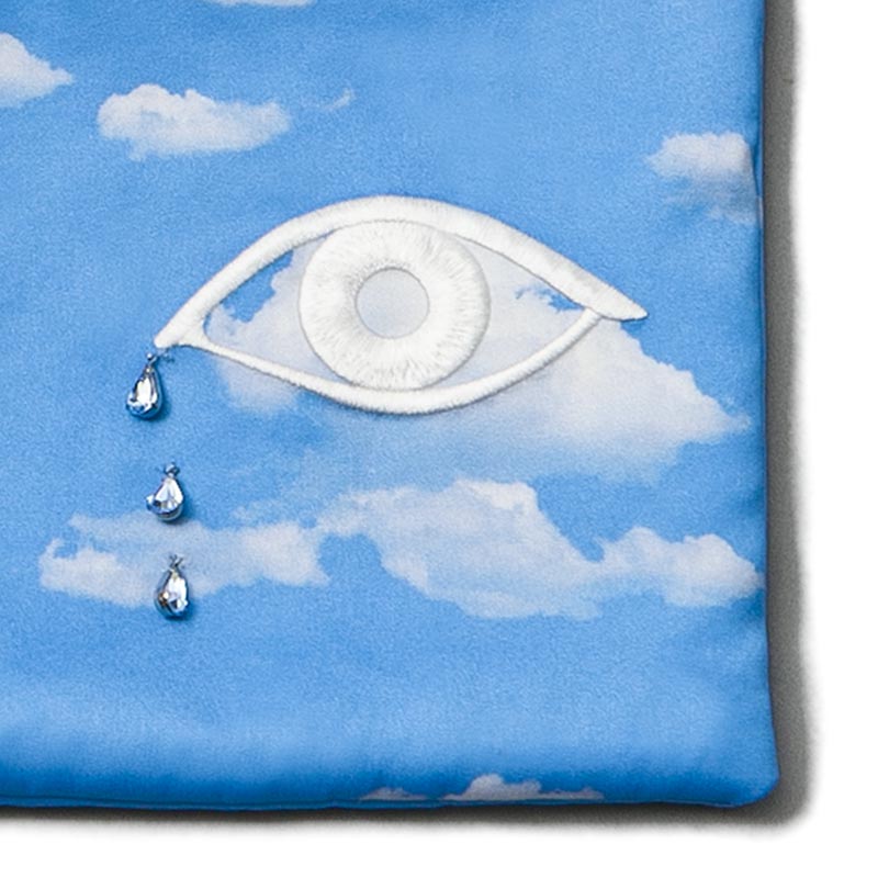 今シーズンのメインビジュアルをそのままバッグにしたアイテムです。ウインクしている図柄に刺繍が施されスワロの涙が3粒というなんとも気になるデザインです。