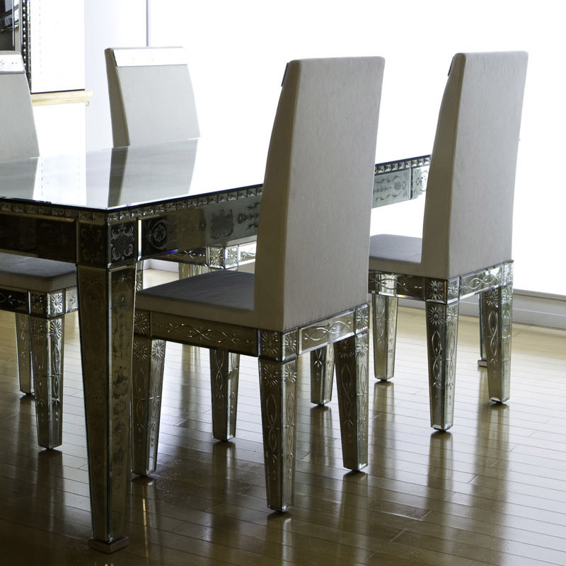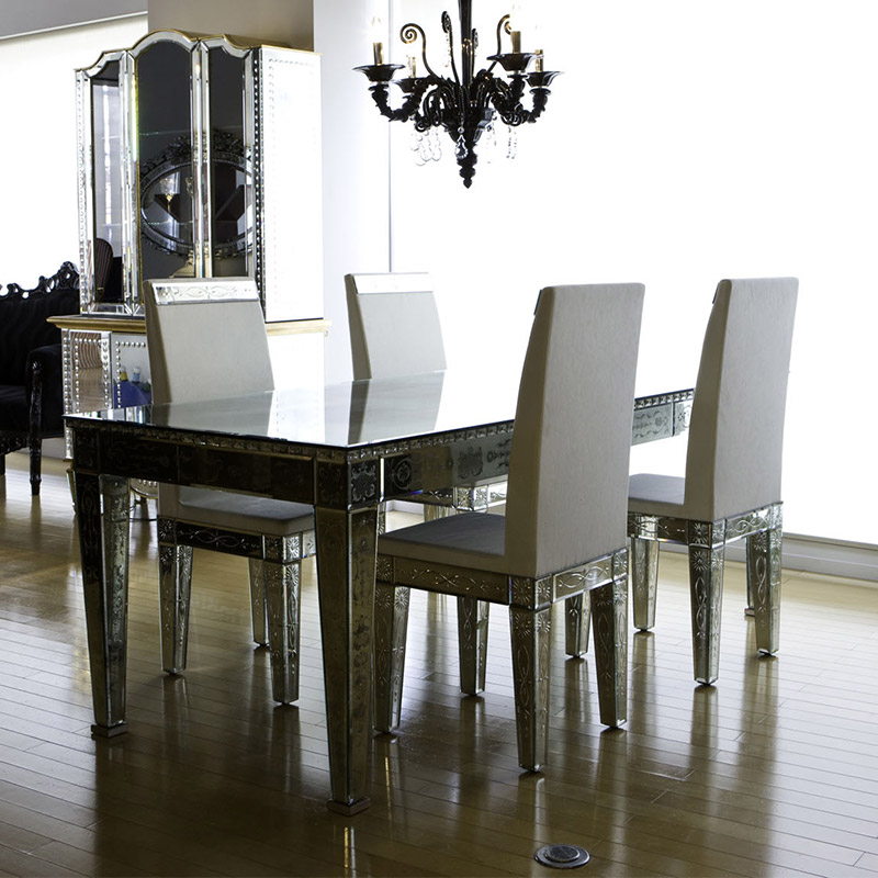 17世紀にパリ・ヴェルサイユ宮殿の「鏡の間」をイタリア・ムラーノ島の職人が製作する際、生み出されたのがこの彫版術によるガラス装飾。鏡に映り込む世界と彫り込まれた装飾が、高貴な幻想の世界へと誘います。