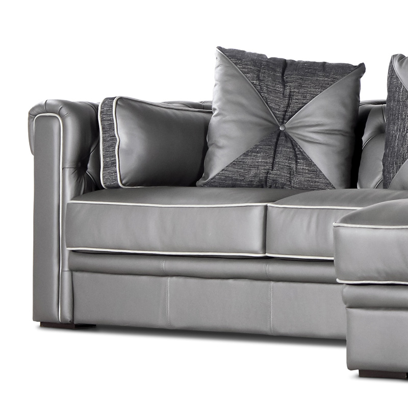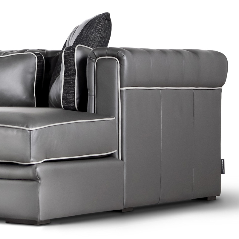アクセントにもなっている背もたれのボタンや、肘や背中が当たる上面の部分のラウンドフォルムは伝統的なデザインです。バイカラーのパイピングで強調したスクエアなフォルムが、伸びやかでモダンなデザインに仕上げています。肘と背もたれが低く、適度な張りを保った座面は、座るというよりもソファの上で過ごすことを想定した仕様。お部屋の様々な方向へコミュニケーションが取りやすいかたちでもあります。