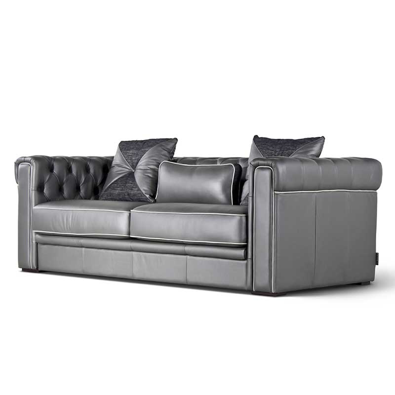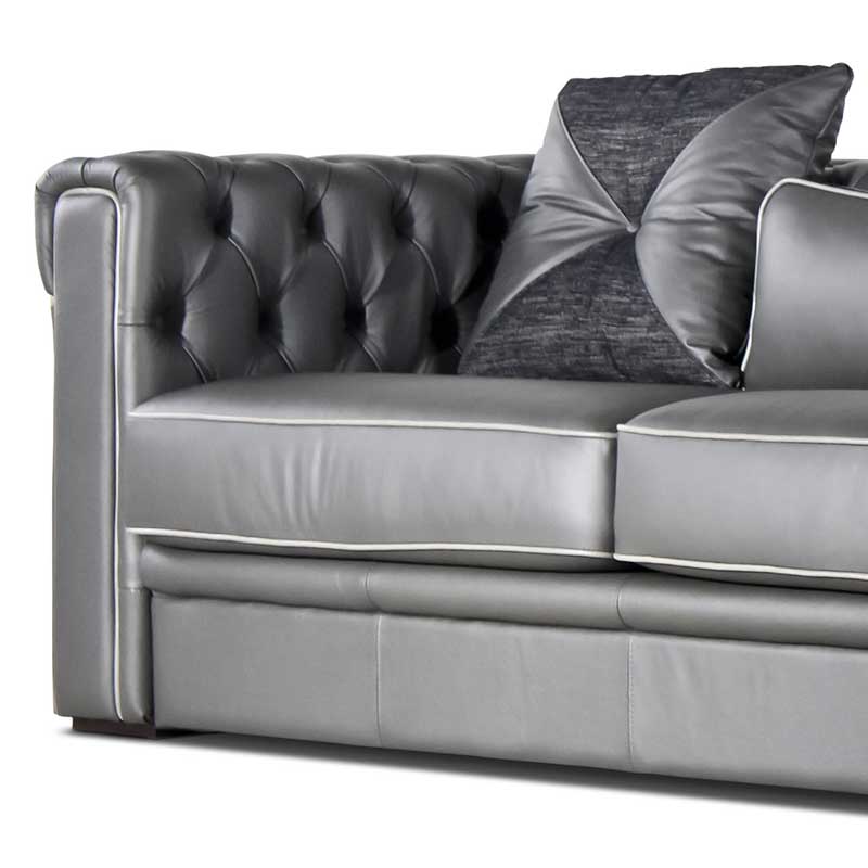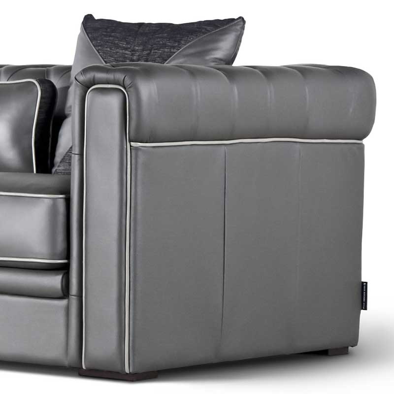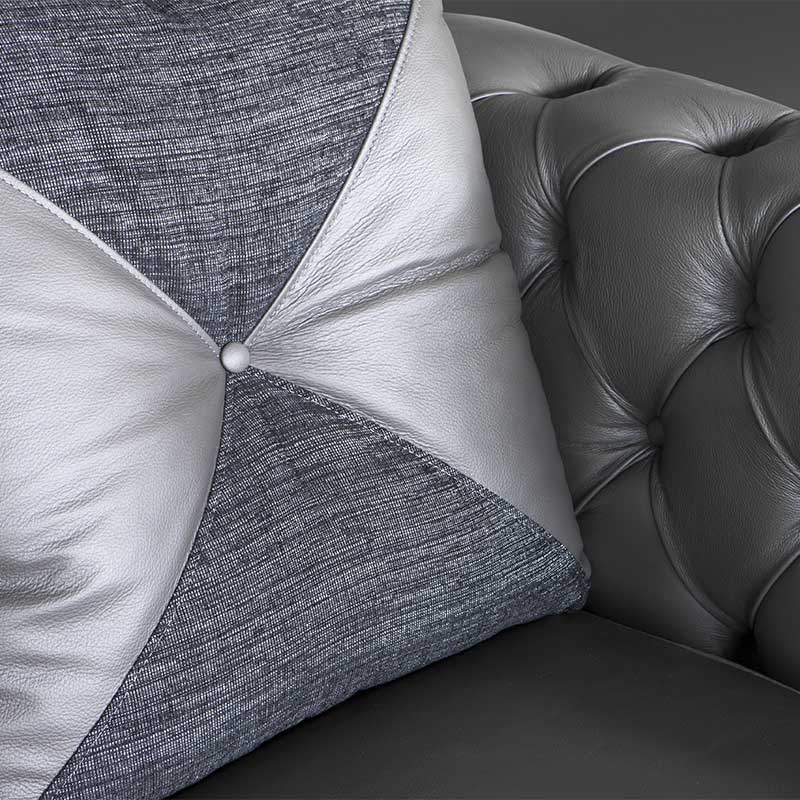 アクセントにもなっている背もたれのボタンや、肘や背中が当たる上面の部分のラウンドフォルムは伝統的なデザインです。バイカラーのパイピングで強調したスクエアなフォルムが、伸びやかでモダンなデザインに仕上げています。肘と背もたれが低く、適度な張りを保った座面は、座るというよりもソファの上で過ごすことを想定した仕様。お部屋の様々な方向へコミュニケーションが取りやすいかたちでもあります。