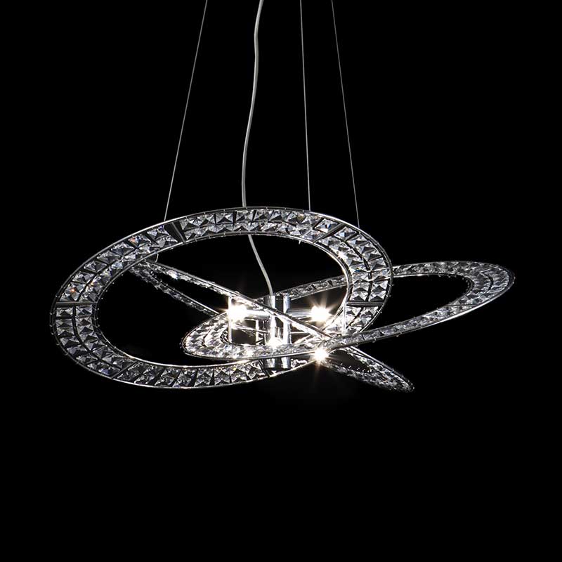 トリロジー[3部作]という名の通り、3つの輪が交差することで生まれる美しいフォルム。その中央から発する光は、輪に施されたクリスタルにより反射し空間を彩ります。圧倒的なフォルムは、空間のメインインテリアとしてご使用ください。