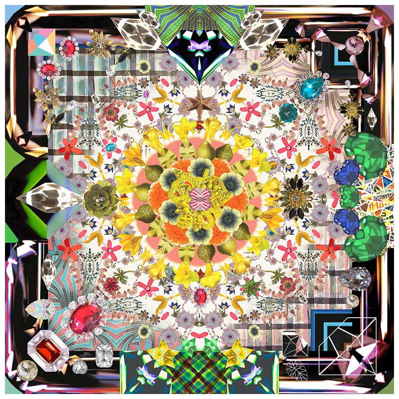 架空の庭を思い起こさせるラグで、キラキラと輝くマドラスのデザインを背景に、宝石と戯れるように色とりどりの花が咲き乱れています。