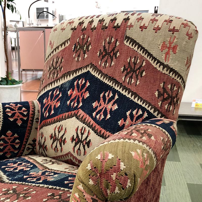 クラシックなカタチに幾何学模様のキリムを貼り込んだ1人掛けソファ