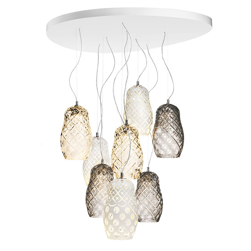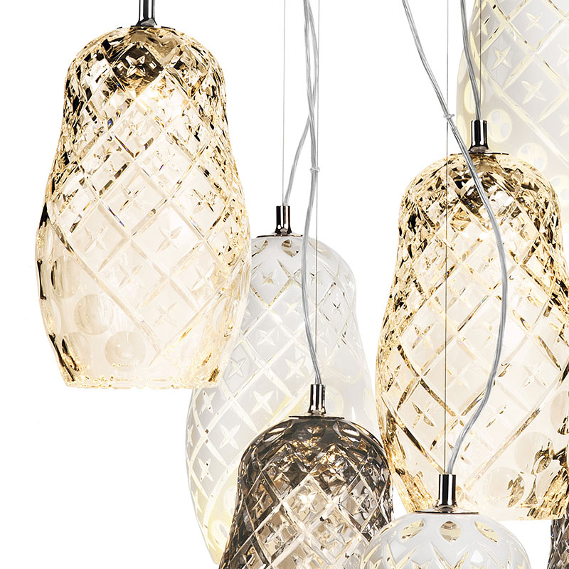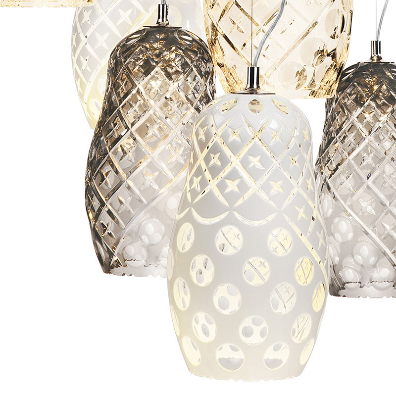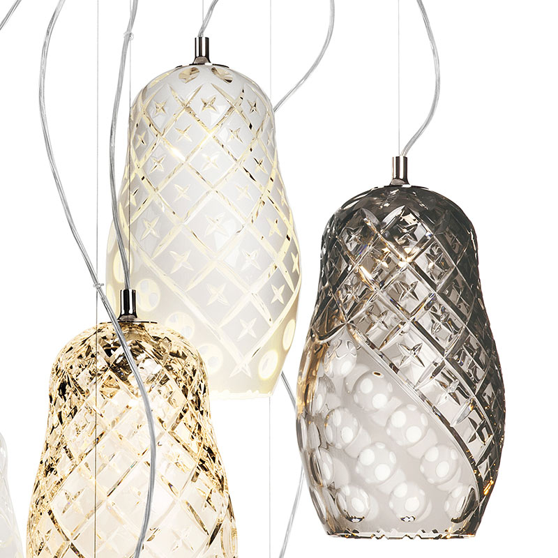 クリア、フランネルグレイ、ホワイトエナメルの優しい色合いと丸みを帯びたフォルムは、クリスタルが固い素材であることを忘れさせるかのように、柔らかな光を演出します。