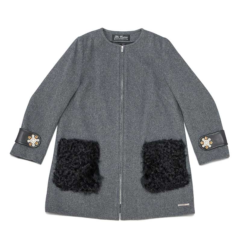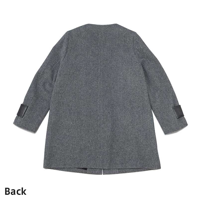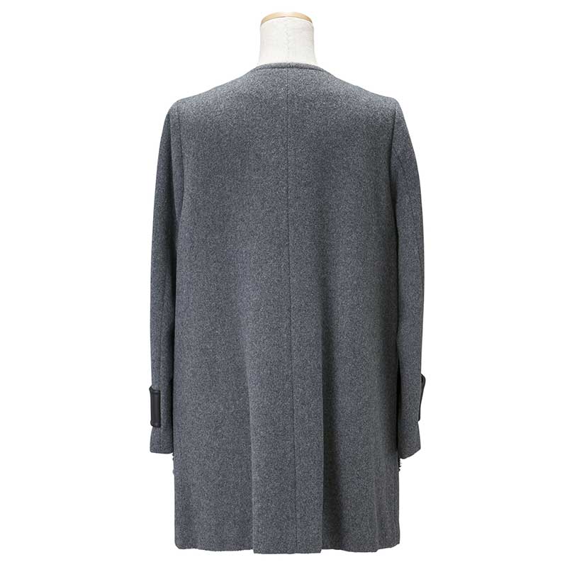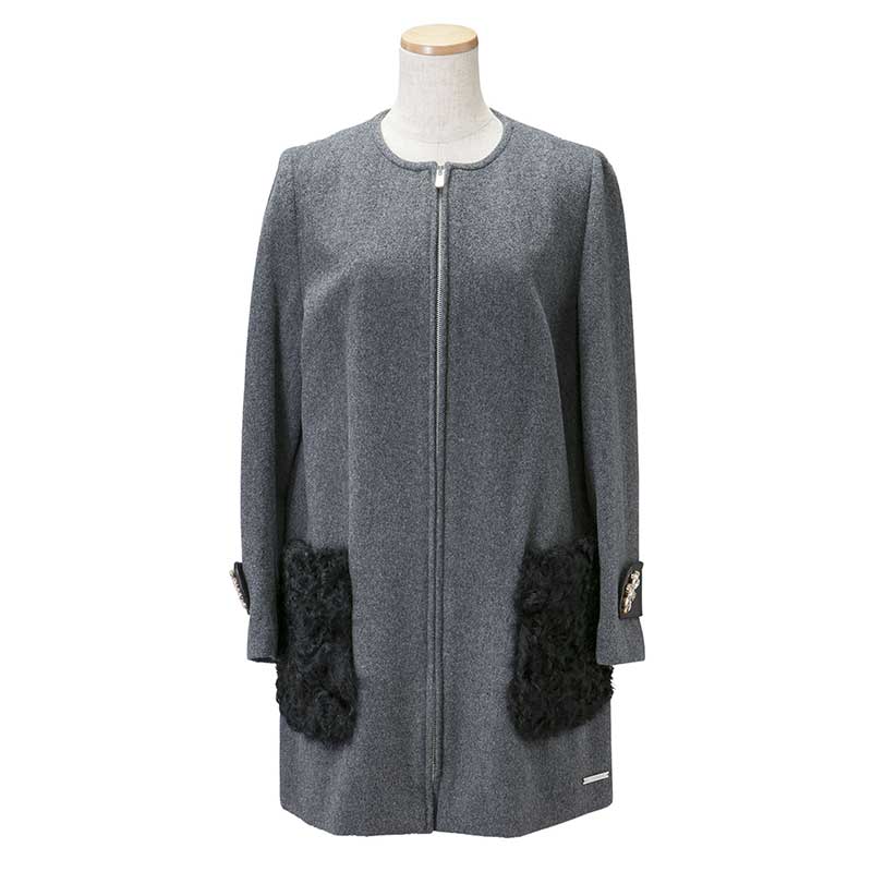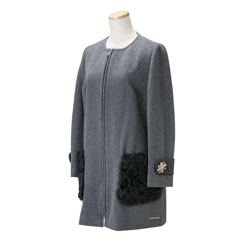 グレーのモッサ素材を使用したノーカラーコートです。ポケットに毛足の長い巻毛のカルガンラム、袖タブに上品なラムレザーを配することでモノトーンの中に素材の違いによる奥行きを出したアイテムになっています。袖タブの贅沢なスワロフスキーエレメントを使用したビジューが印象的です。首周りがすっきりとしたデザインなのでアウターとしてはもちろん、ワンピースとしてもご着用いただけます。