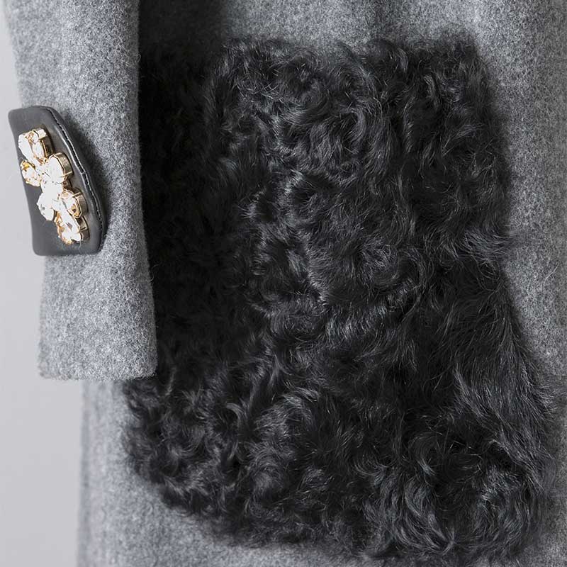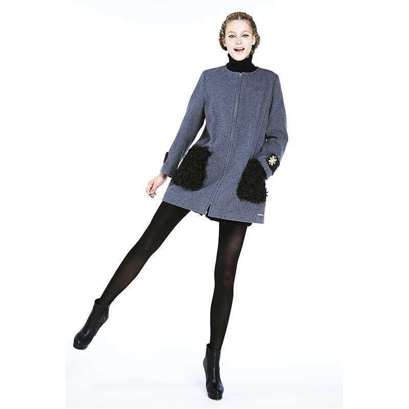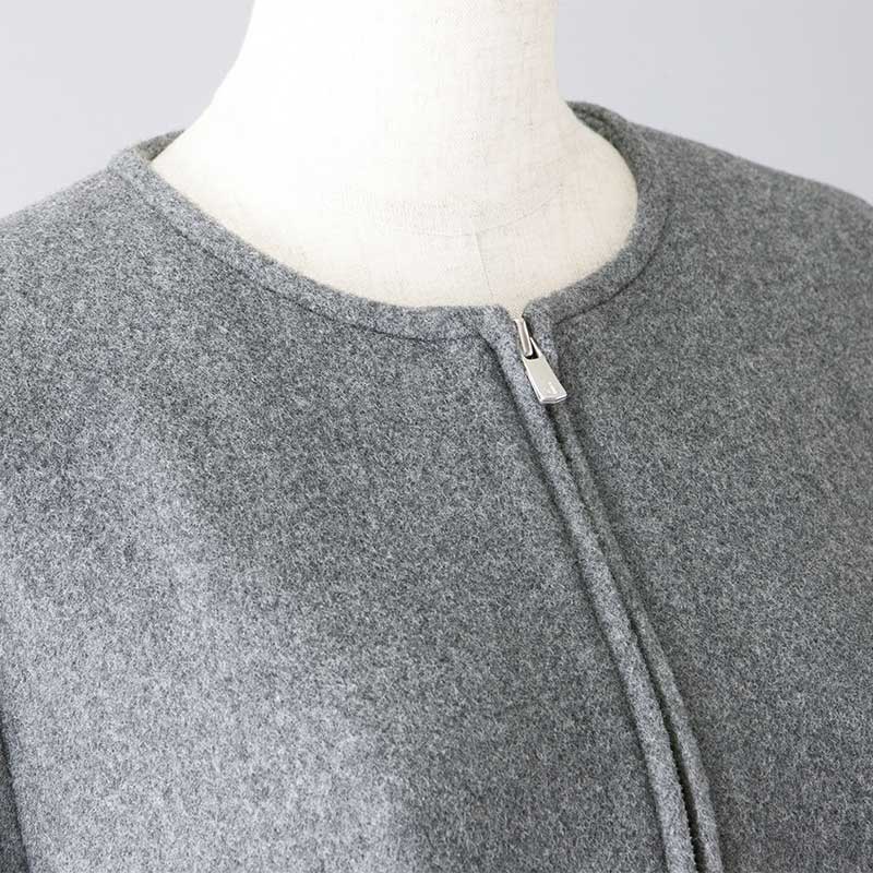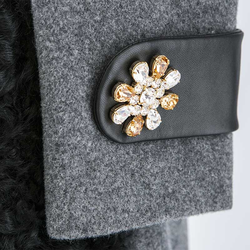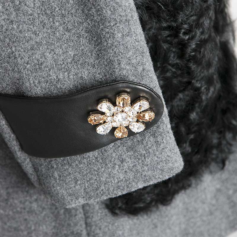 グレーのモッサ素材を使用したノーカラーコートです。ポケットに毛足の長い巻毛のカルガンラム、袖タブに上品なラムレザーを配することでモノトーンの中に素材の違いによる奥行きを出したアイテムになっています。袖タブの贅沢なスワロフスキーエレメントを使用したビジューが印象的です。首周りがすっきりとしたデザインなのでアウターとしてはもちろん、ワンピースとしてもご着用いただけます。