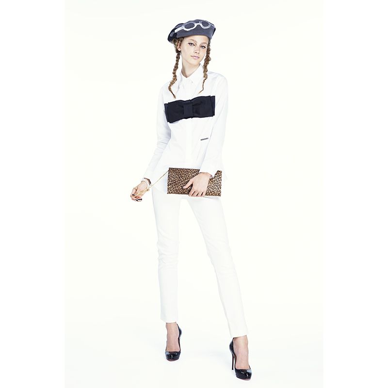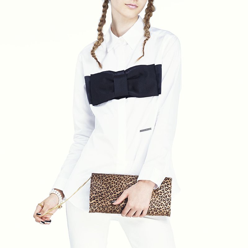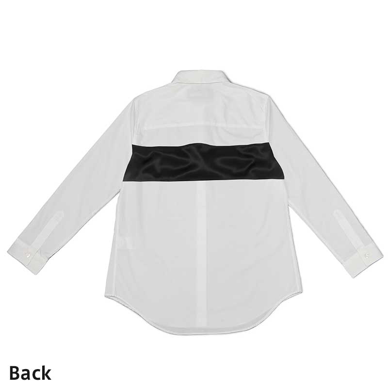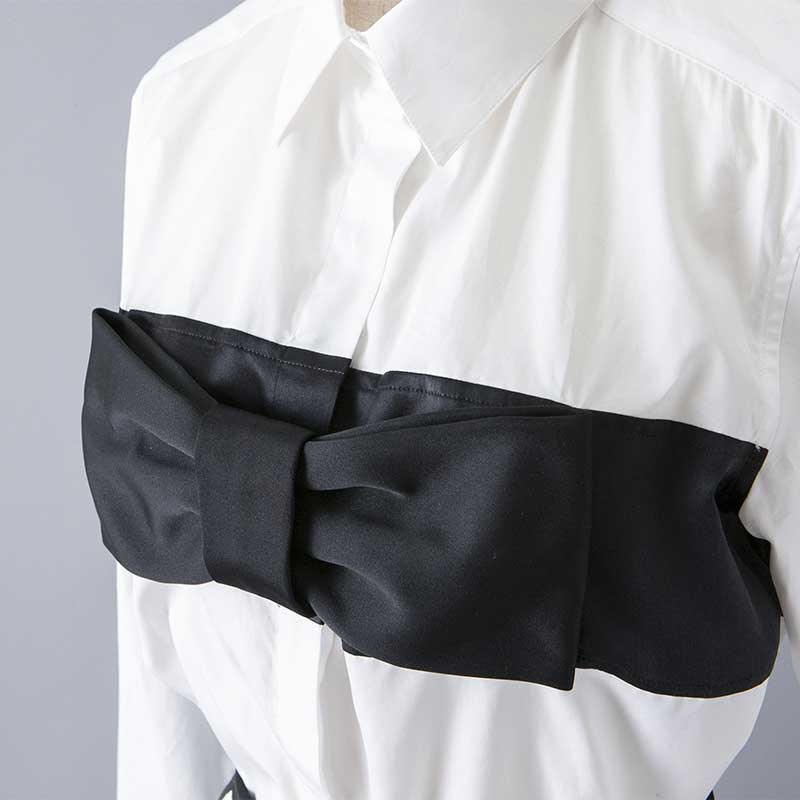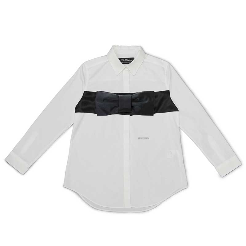 大きな黒いリボンのコザージュを大胆にあしらったシャツです。リボンは4隅のホックで取り外せる仕様になっています。高級綿であるエジプト綿を使用しております。