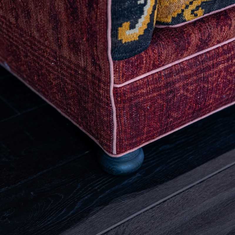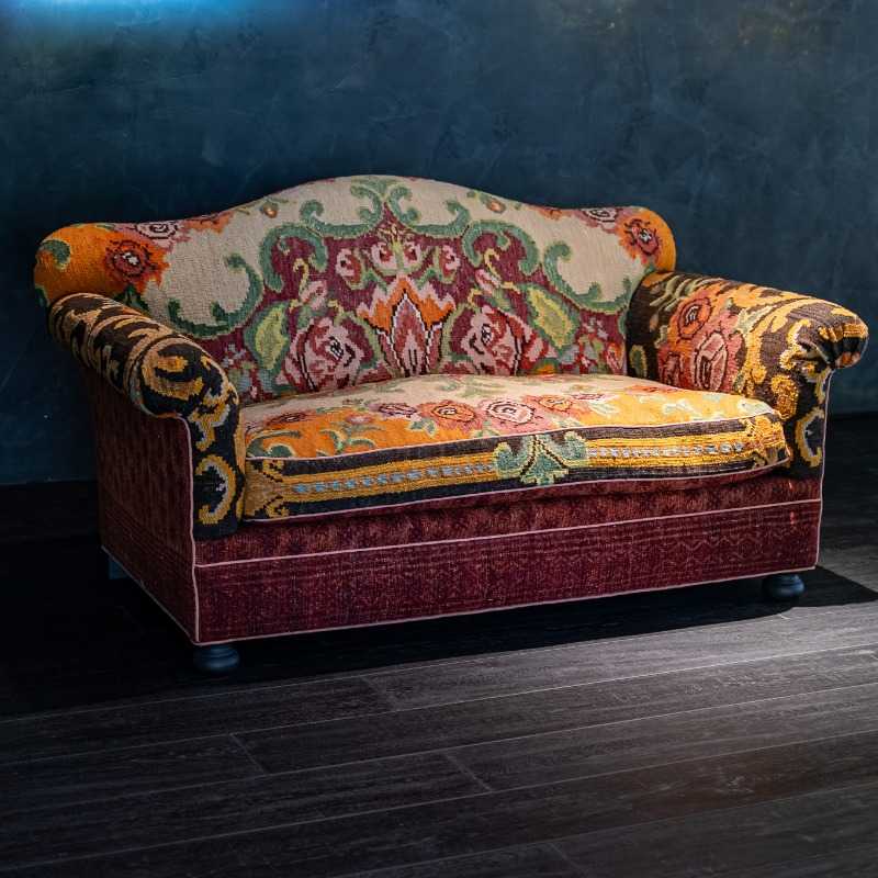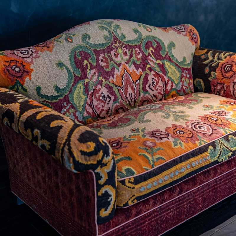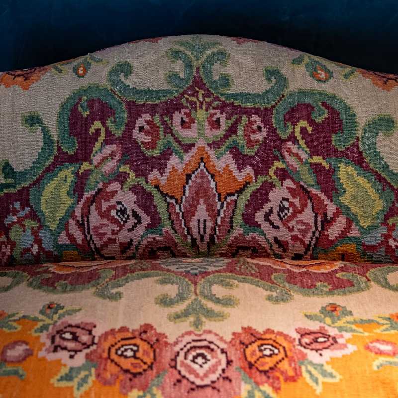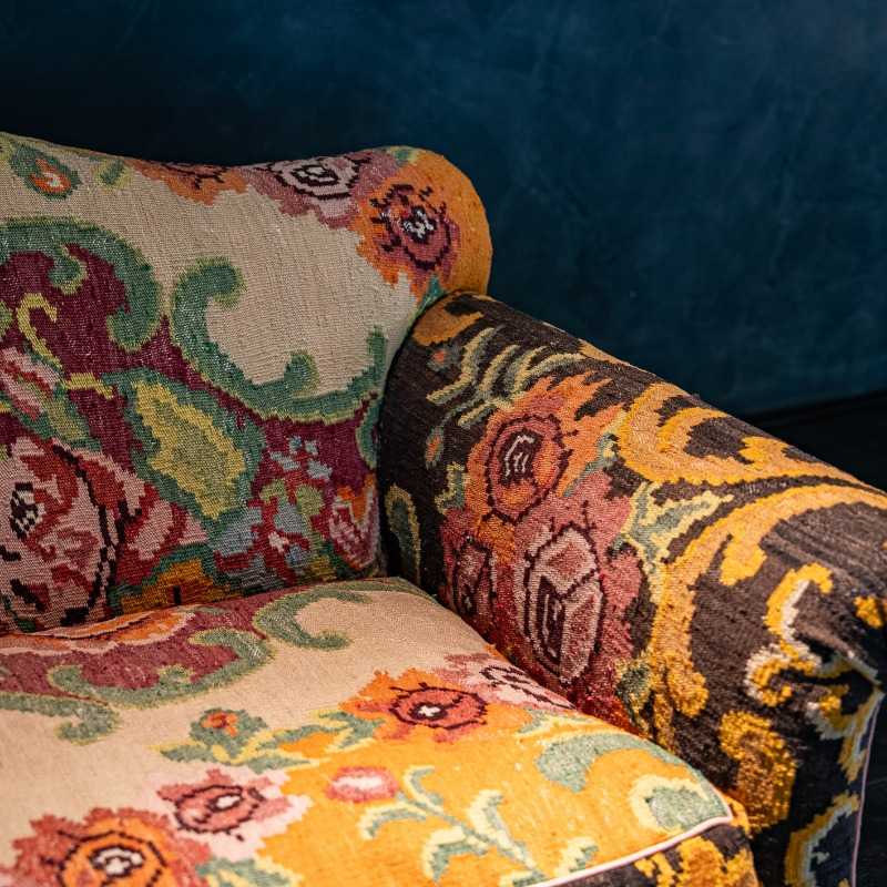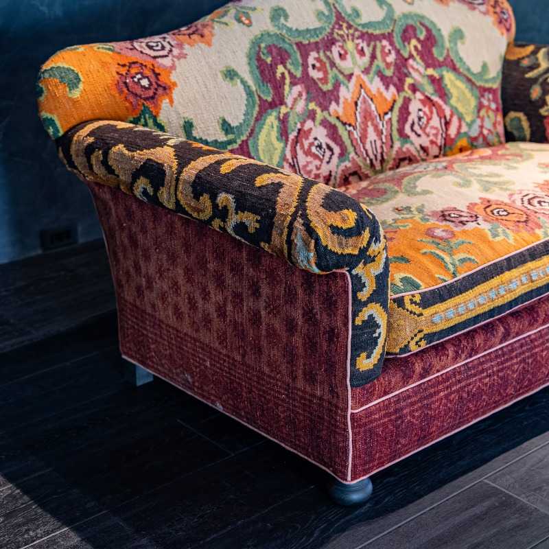 花を中心にして葉をあしらった伝統的な文様「ヘラティ」を全面に施したソファ。丁寧なつくりで、印象的なキリムを貼り込んででいます。シンプルなインテリアにコーディネートすることで、空間のアクセントになるソファです。