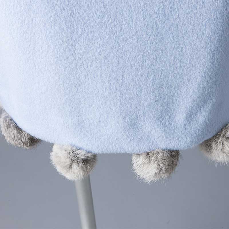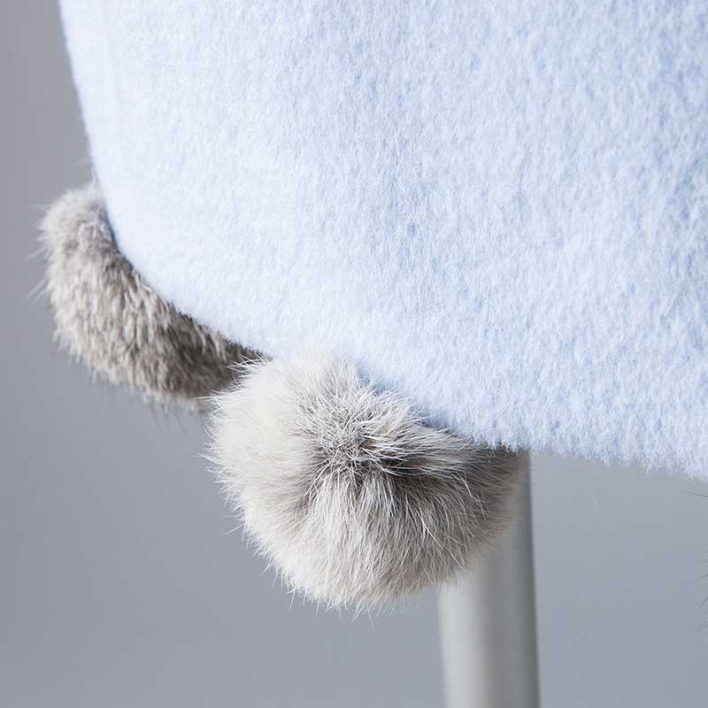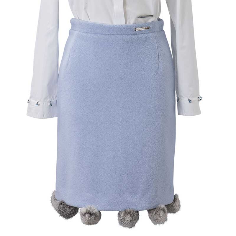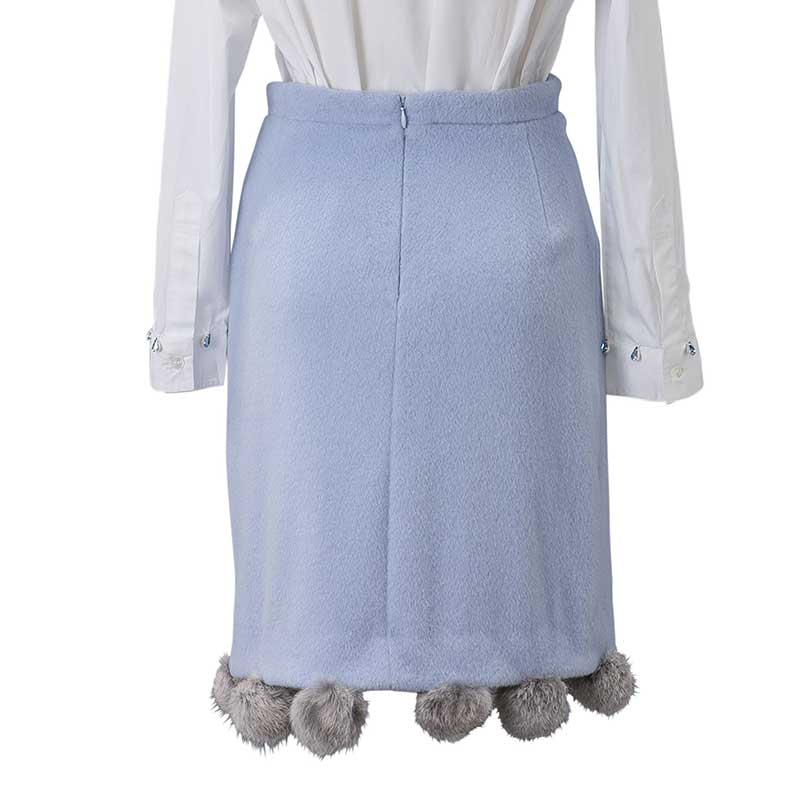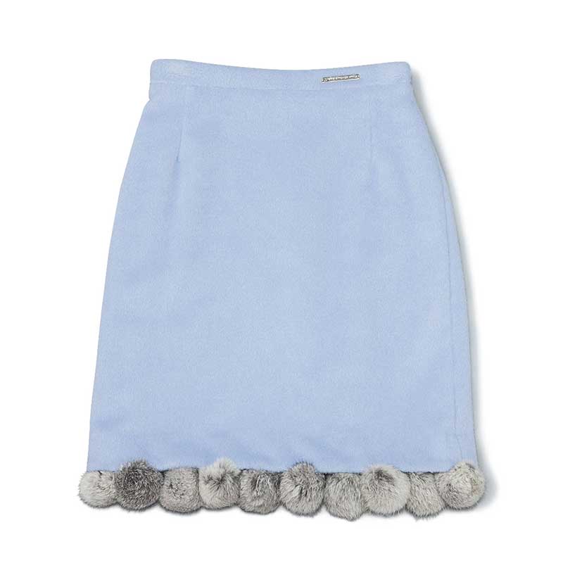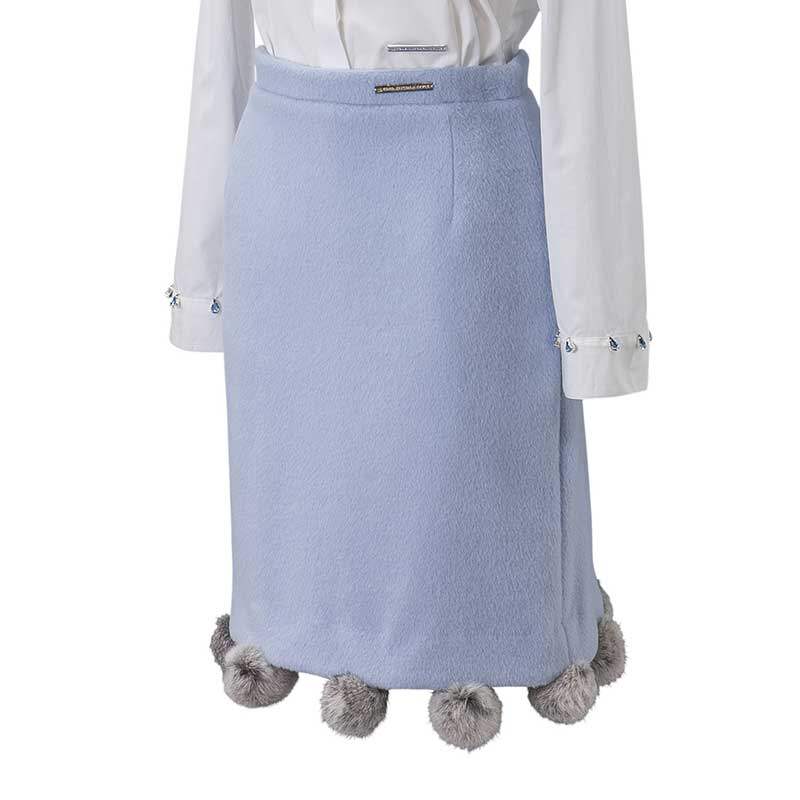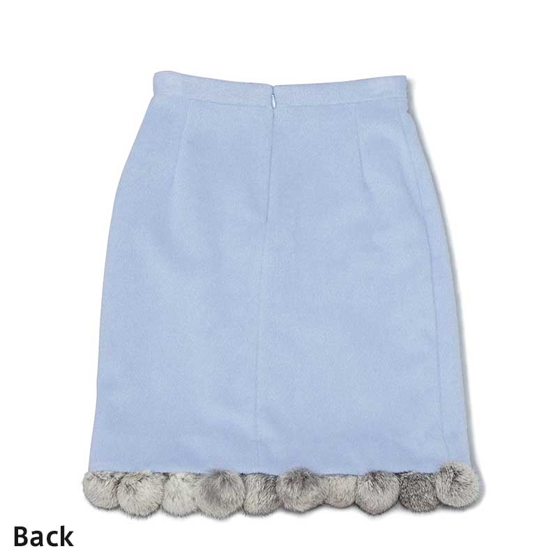 ラビットファーのボンボンをスカートの裾に等間隔で配したウールスカートです。膝丈のデザインは落ち着いた印象ですが、ボンボンが遊びゴコロを感じさせるスカートです。