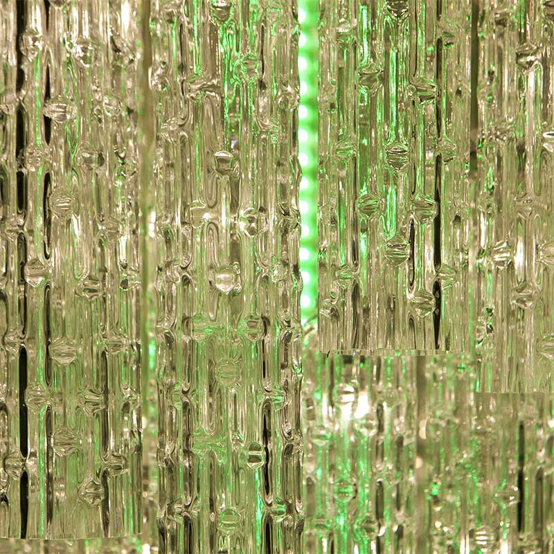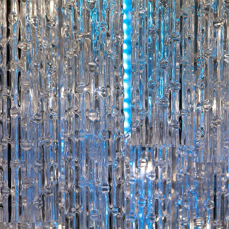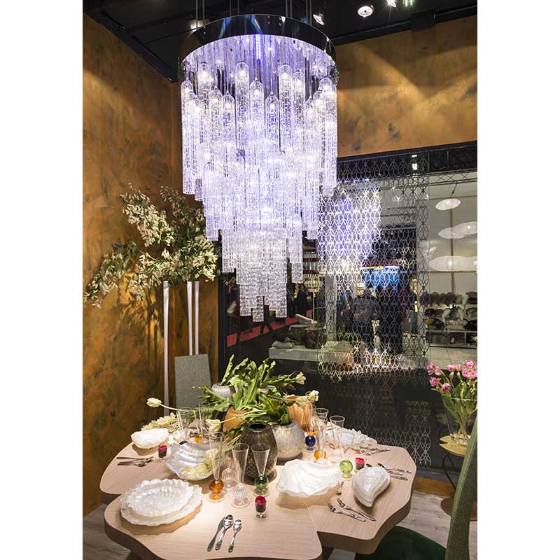 90本の筒状クリアガラスオーナメントが特徴の大型シャンデリアです。天井が高い空間や、吹き抜け、階段上、店舗などに最適です。オーナメントに囲まれた中心にはLEDバーがあり、付属のリモコンで強弱や光り方、色の調整ができます。