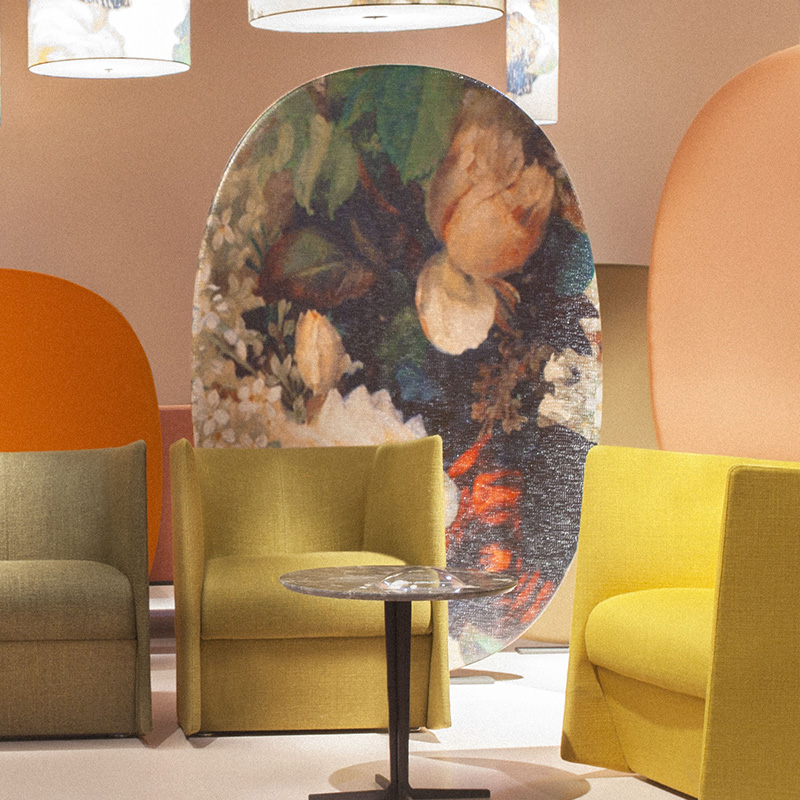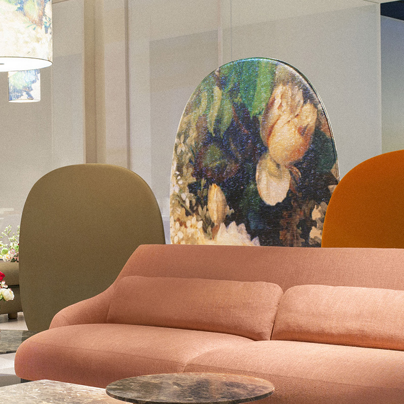 大胆に描かれた花模様が特徴のスクリーン。裏表がないので、空間の間仕切りに最適です。