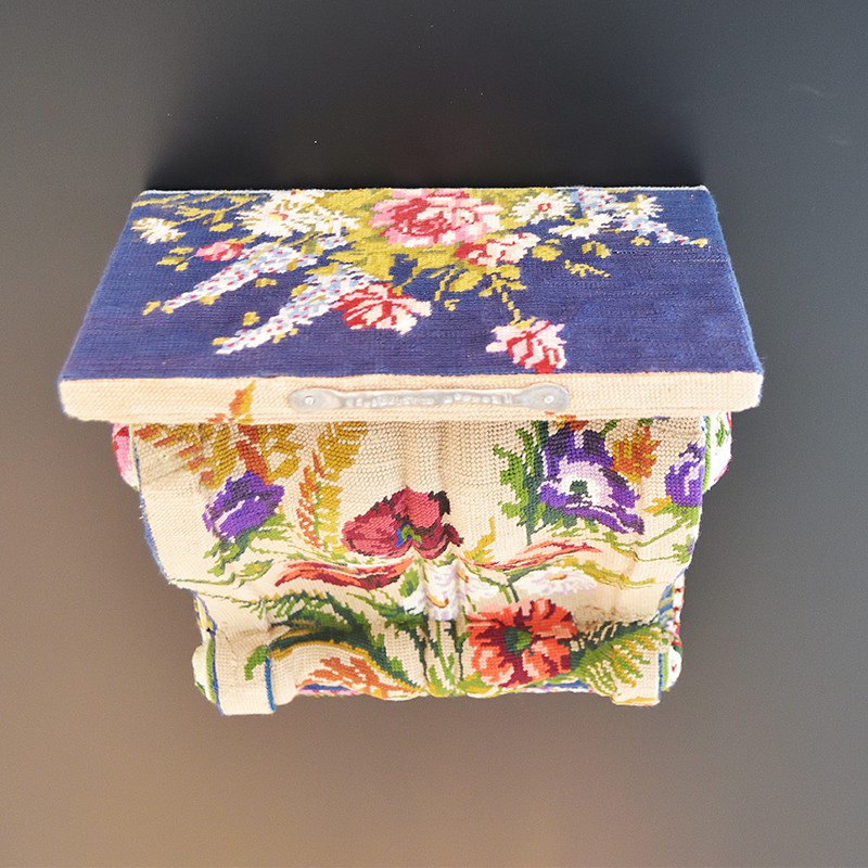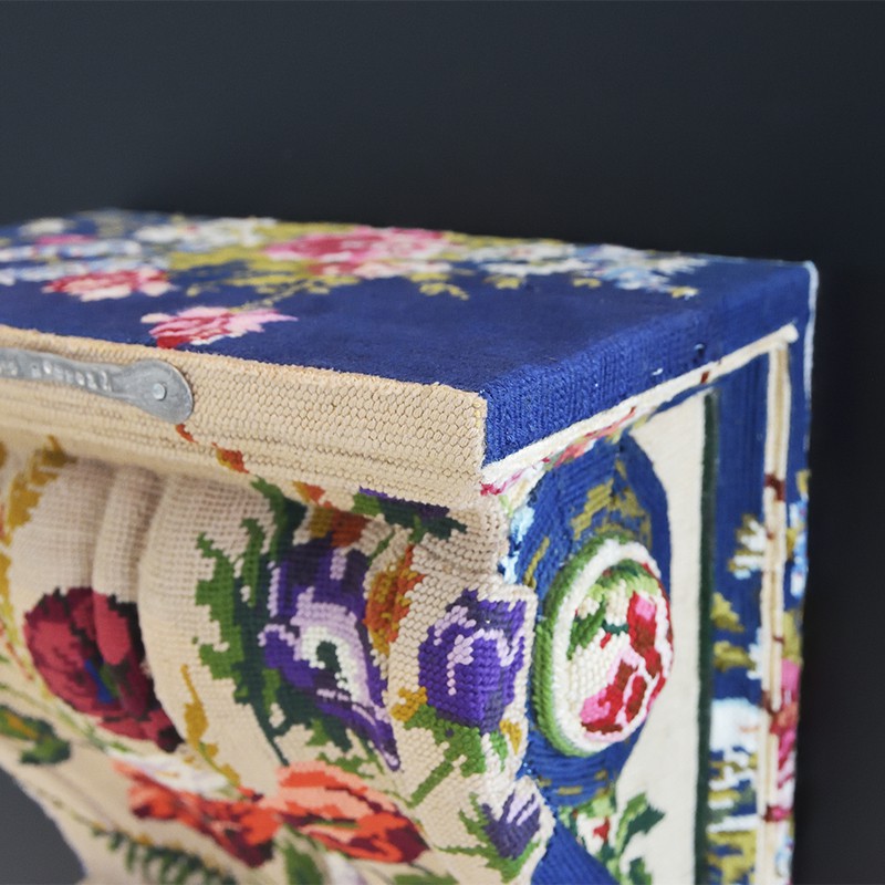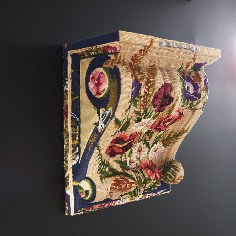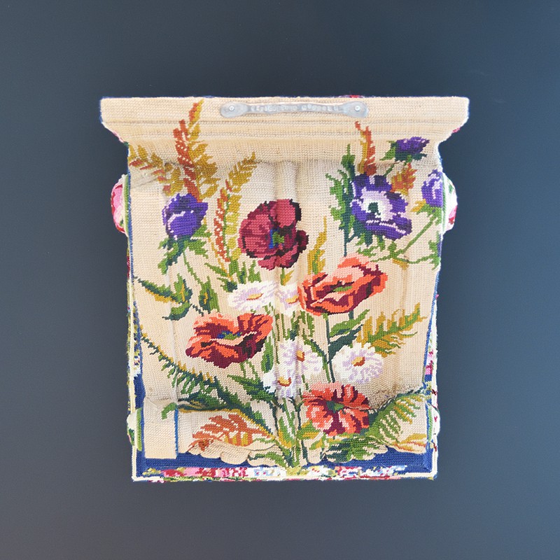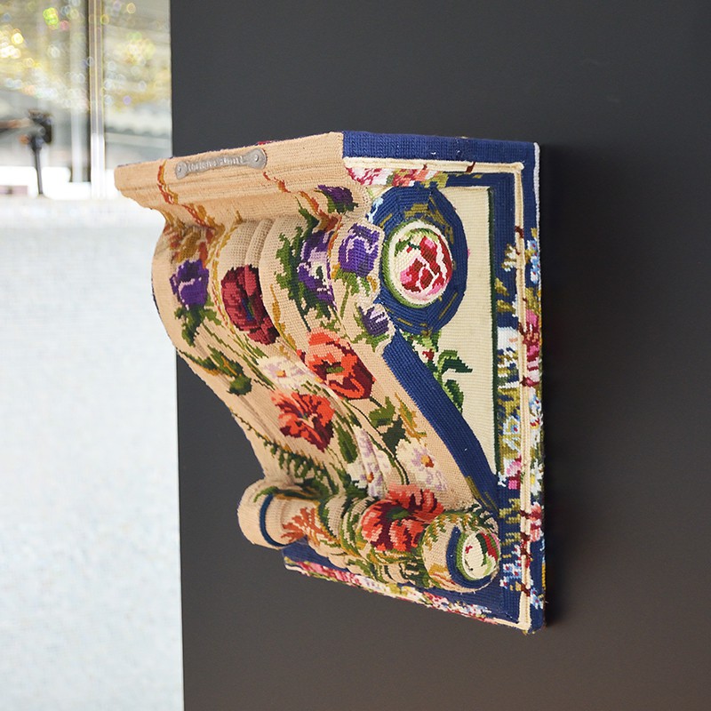 キャンパス生地全体をウールの糸で刺繍を施す技法。仕上がりはまるで織物のような印象で、ウール糸を使用することから、タペストリーとして装飾として用いるだけでなく。室内の温度調整の役割も果たす実用性も兼ね備えています。