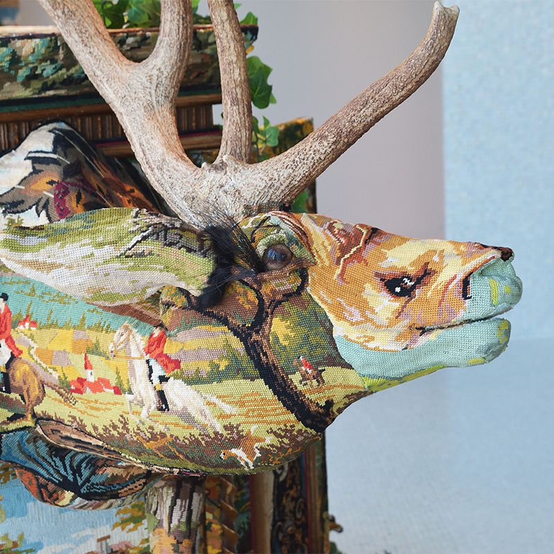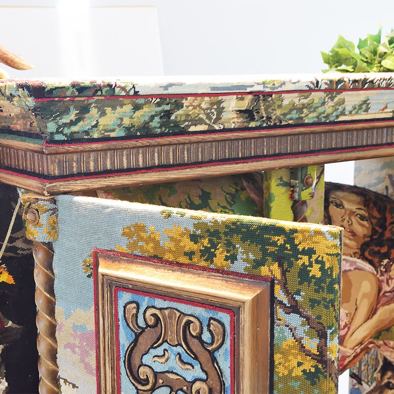 キャンパス生地全体をウールの糸で刺繍を施す技法。仕上がりはまるで織物のような印象で、ウール糸を使用することから、タペストリーとして装飾として用いるだけでなく。室内の温度調整の役割も果たす実用性も兼ね備えています。