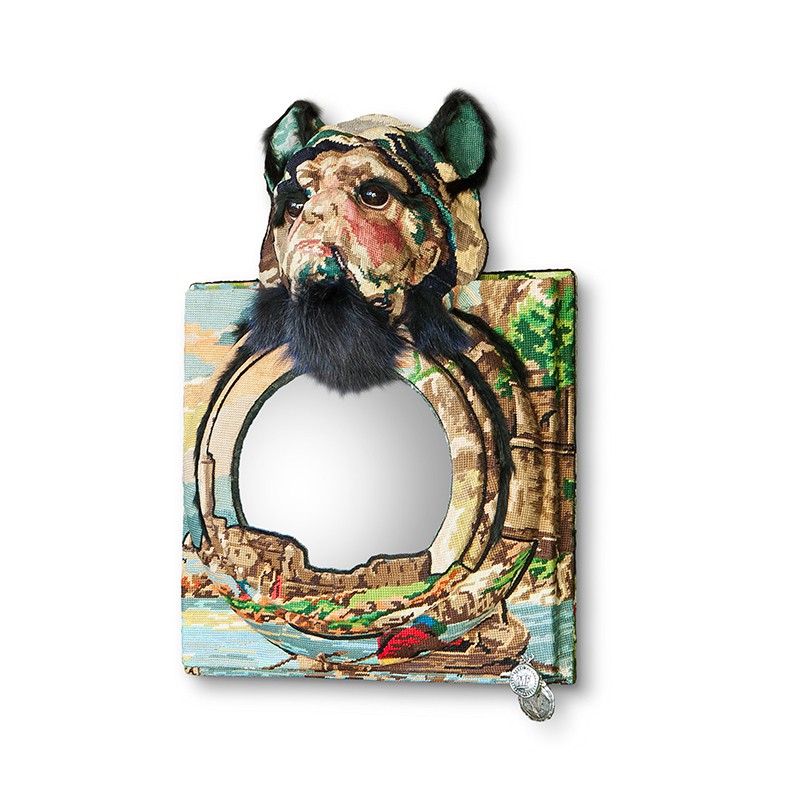 本体上部のブルドックマスクは、動物を忠実に再現しているというよりも、まるで人間のような顎ひげと凛とした黒い瞳が特徴的です。ミラーは本体下部を豊かに流れる河の絵と一体化しており、裏側はリバースサーティフィケイトのメタルプレートがあります。小さな面積で広い範囲を映すことができる凸面鏡(コンベックスミラー)の機能があり、裏面上部の中央には壁に掛けて使用するための穴があります。