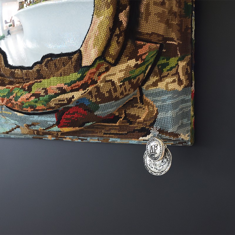 キャンパス生地全体をウールの糸で刺繍を施す技法。仕上がりはまるで織物のような印象で、ウール糸を使用することから、タペストリーとして装飾として用いるだけでなく。室内の温度調整の役割も果たす実用性も兼ね備えています。