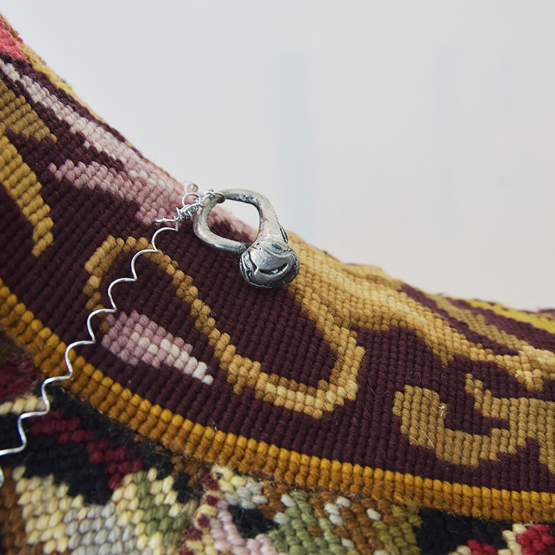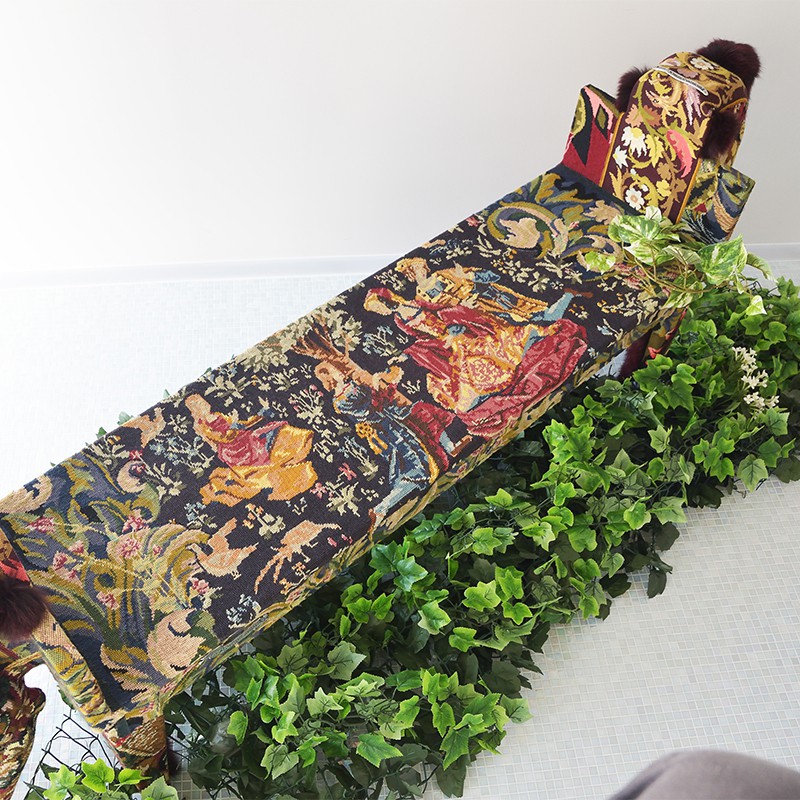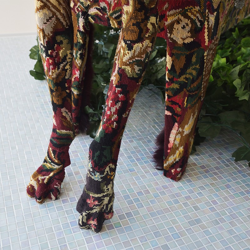 キャンパス生地全体をウールの糸で刺繍を施す技法。仕上がりはまるで織物のような印象で、ウール糸を使用することから、タペストリーとして装飾として用いるだけでなく。室内の温度調整の役割も果たす実用性も兼ね備えています。