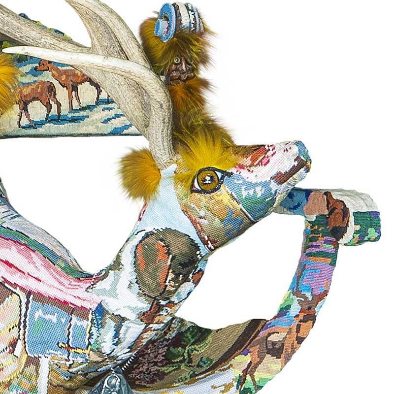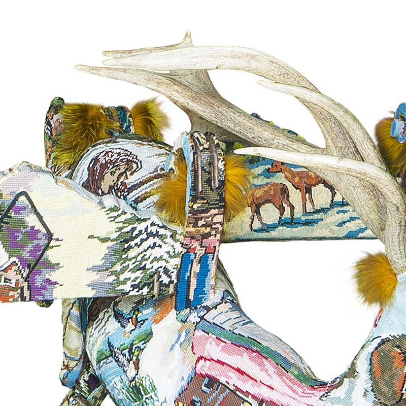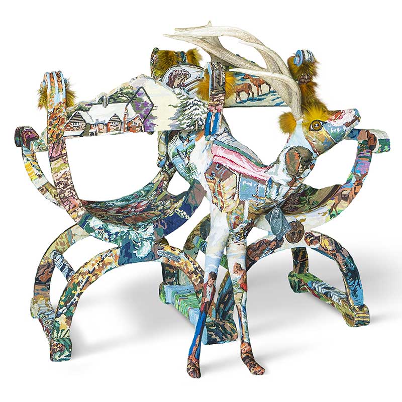 跳びはねた鹿を中心にして椅子が2脚組み合わせた作品です。椅子はそれぞれ反対向きに座るように組み合わされていますが、鹿が2人の距離感を近づけることでコミュニケーションが弾みます。椅子は独特な半円形状になっており、マスクの部分には鹿と同じファーがあしらわれています。鹿の角は立派なサイズの角が一本になっています。