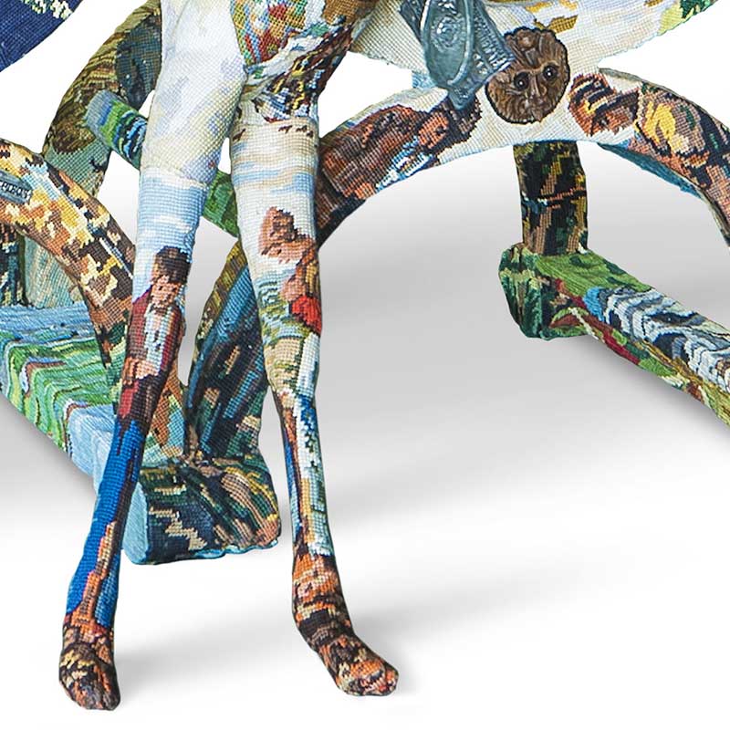キャンパス生地全体をウールの糸で刺繍を施す技法。仕上がりはまるで織物のような印象で、ウール糸を使用することから、タペストリーとして装飾として用いるだけでなく。室内の温度調整の役割も果たす実用性も兼ね備えています。