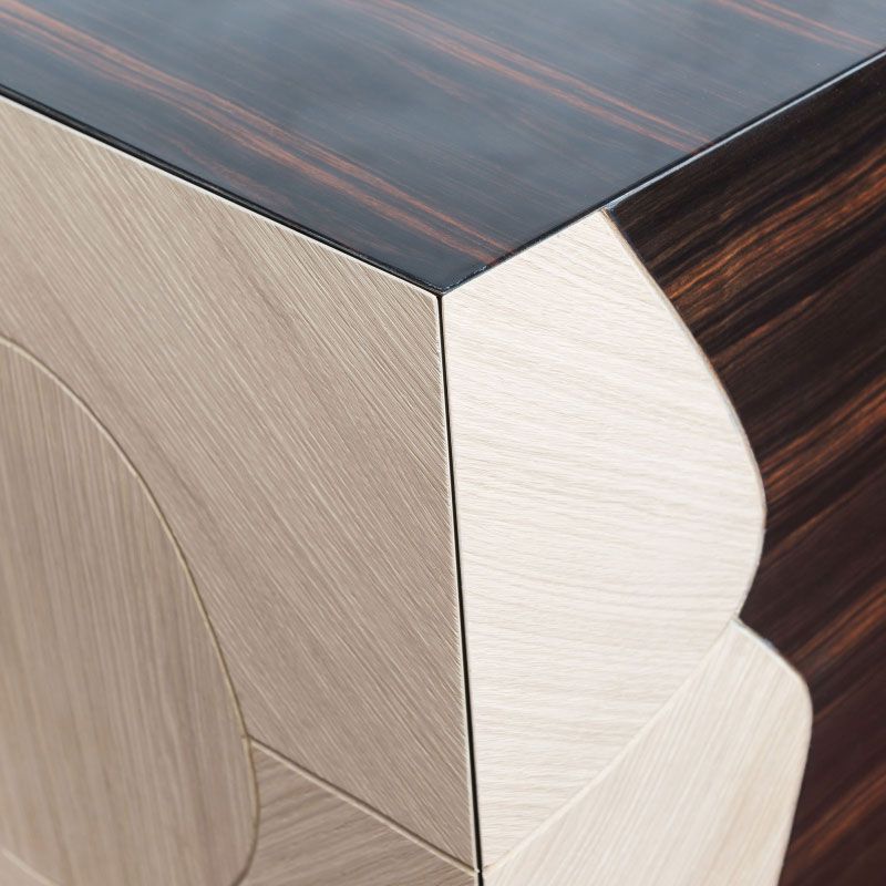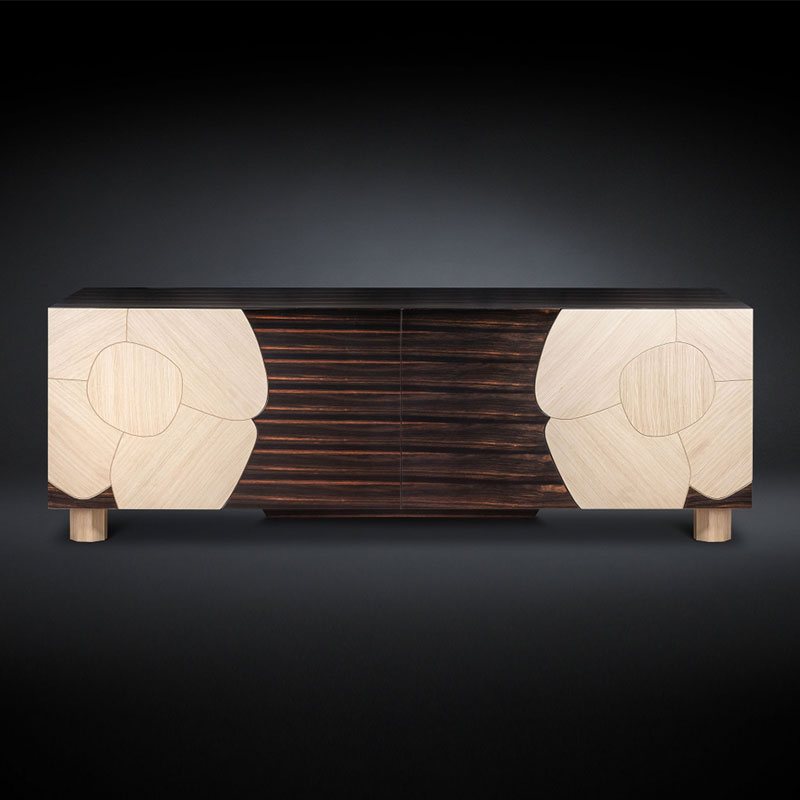 グロッシーに艶有り仕上げがされたエボニーと、ナチュラルなオーク材という異なる魅力を持つ2種類の木がコンビネーションになった大型のサイドボードです。大きなフラワーモチーフが側面まで回りこみ、左右に花開くデザインは、ドアの機能も兼ねています。扉はプッシュ式のためハンドルレスになっており、さらに四隅では木口が露出しないように処理がなされ、美しい木目を最大限に活かす工夫がされています。