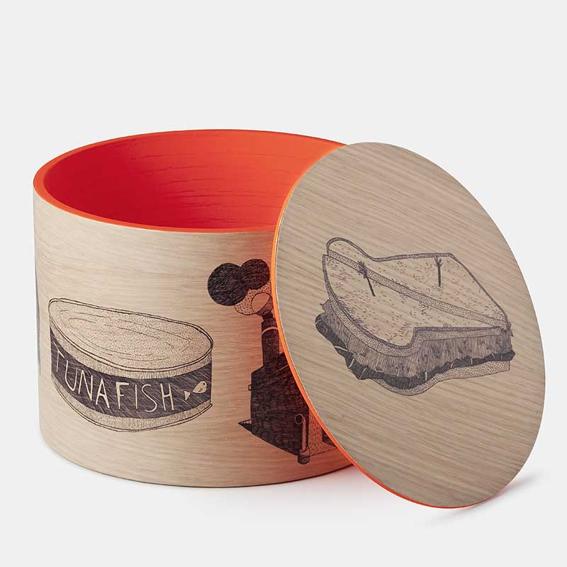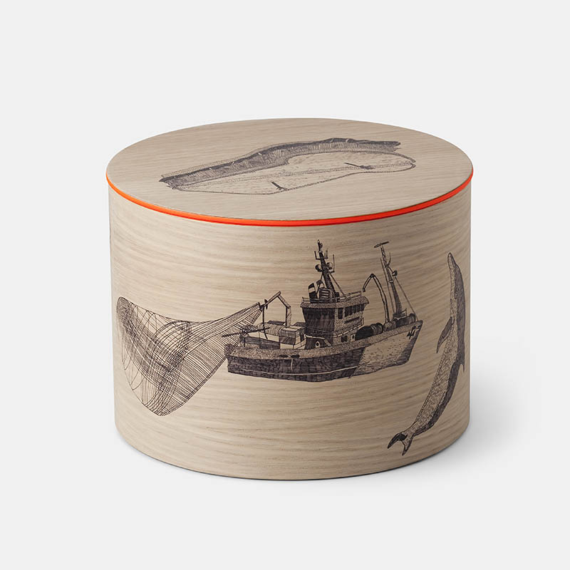 それぞれの箱には手書きの絵が添えられており、各地を旅した旅行カバンさながらにそれぞれの物語を語っています。この絵は特別に書き下ろされたもので、「マグロの一生」「ウミガメの一生」「木の一生」と、それぞれ環境問題について語りかけています。