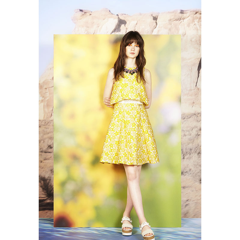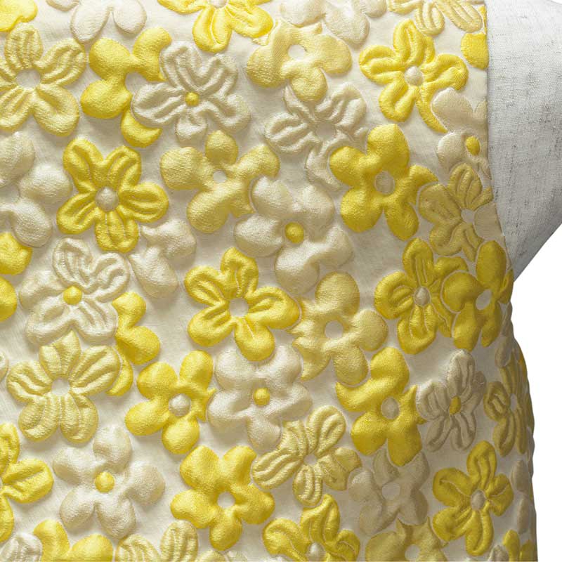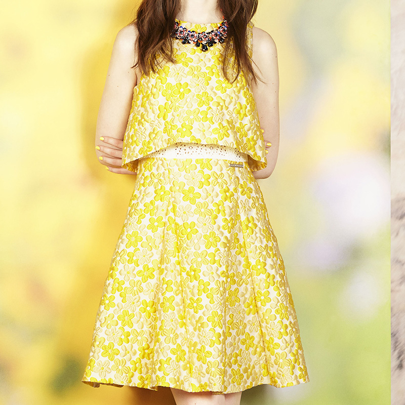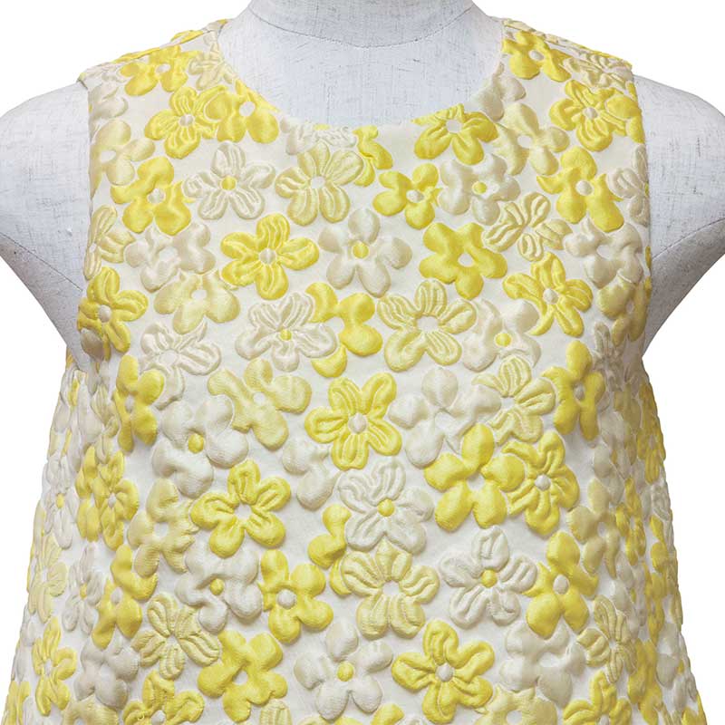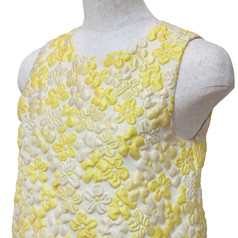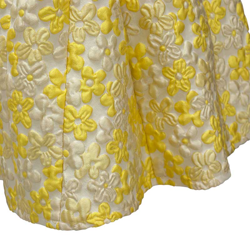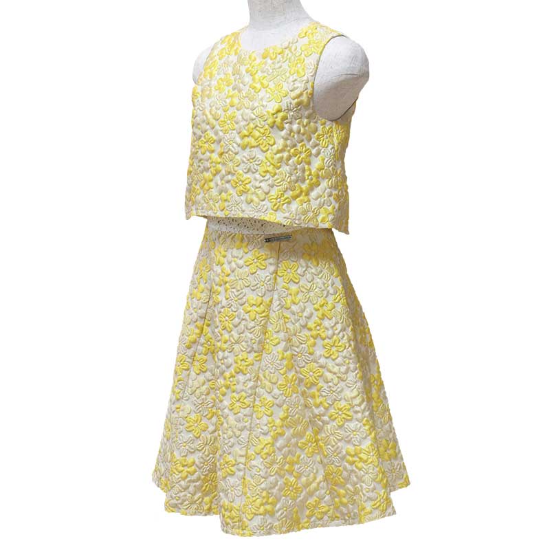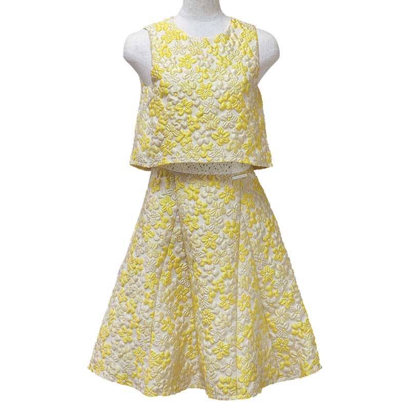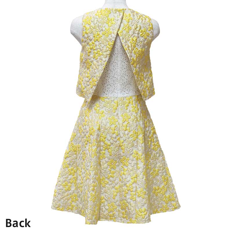 黄色の花柄が明るい印象のイタリア製のふくれ織りの生地を使用したワンピースです。一見上下セパレートのようなデザインが特徴です。上半身のインナーに白い花柄のレース生地を使用しており、動きによって見え隠れするようになっています。