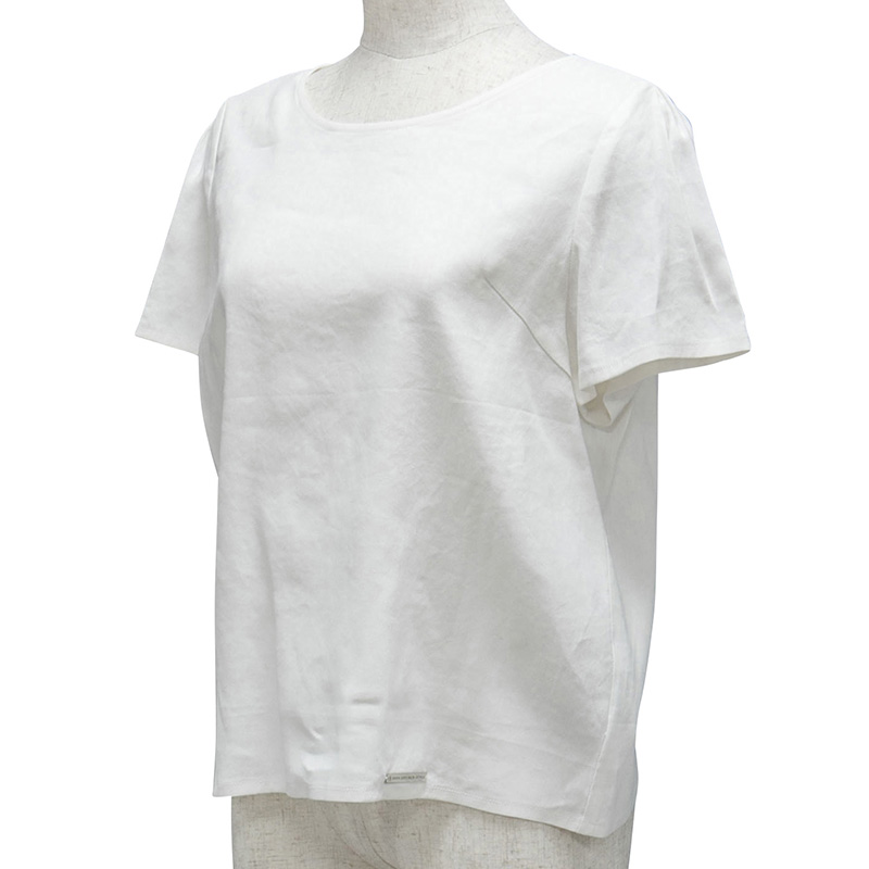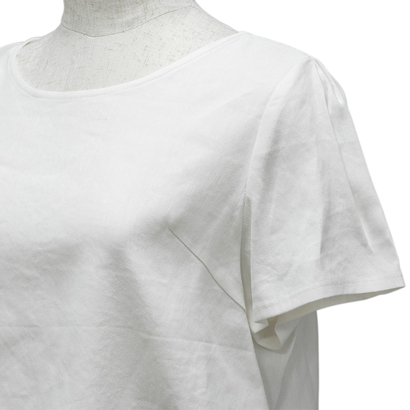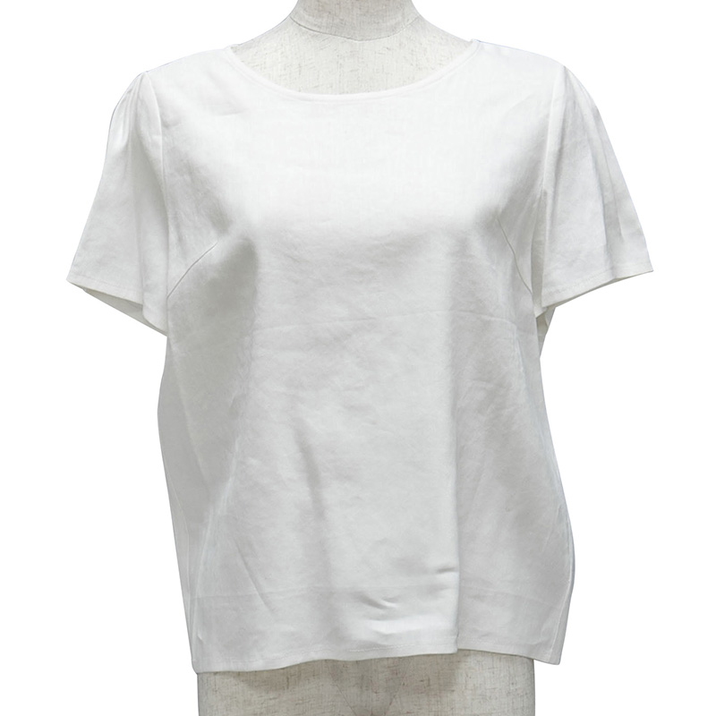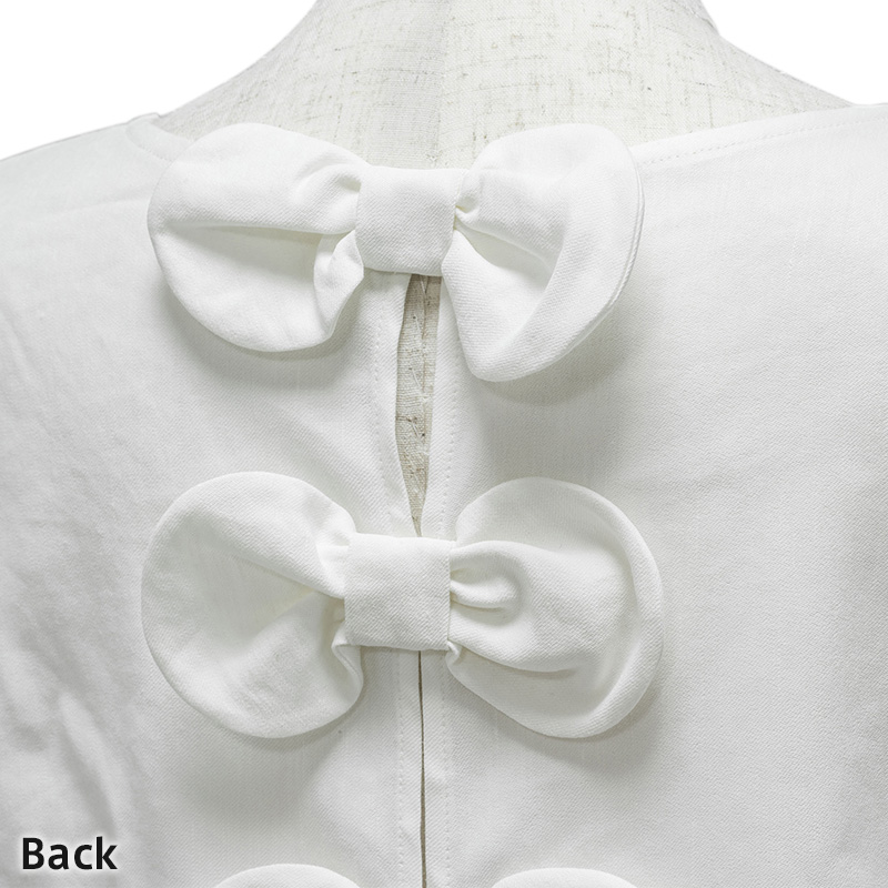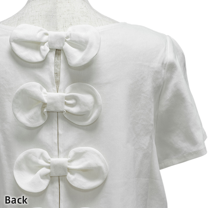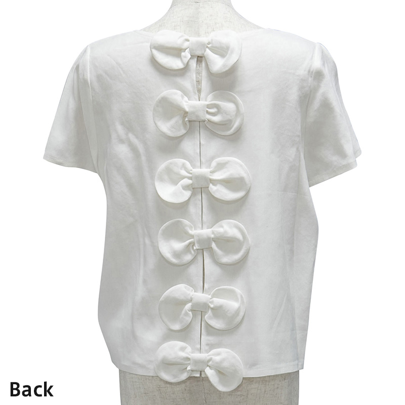 背中のスリットに丸みのあるリボンが特徴のブラウスです。イタリア製の綺麗めのリネン混の素材が涼しげな印象です。