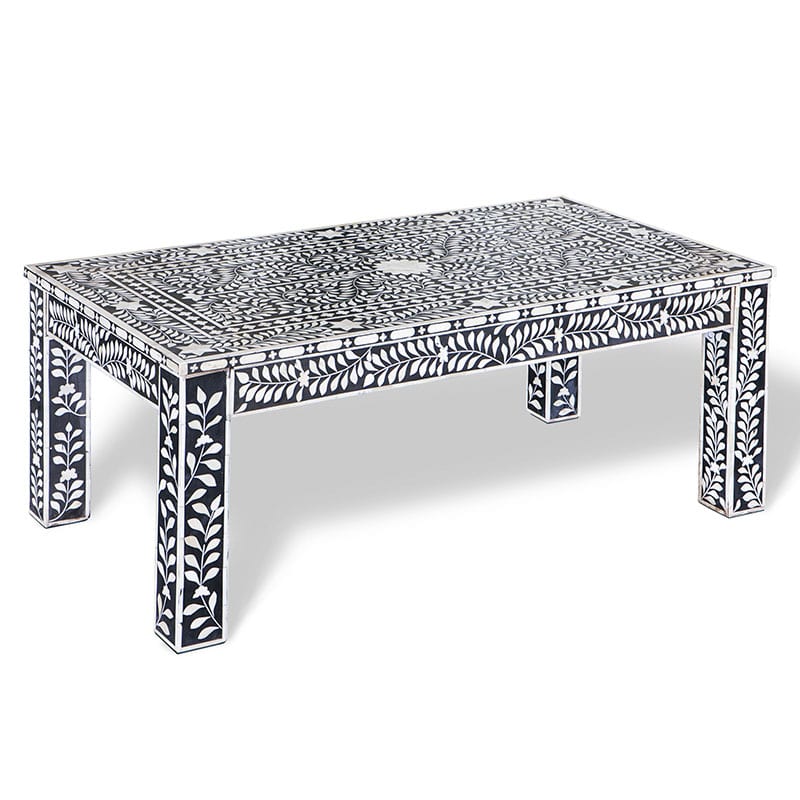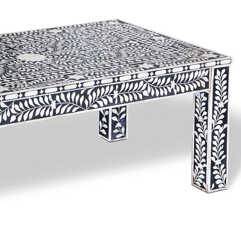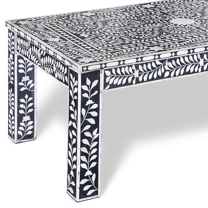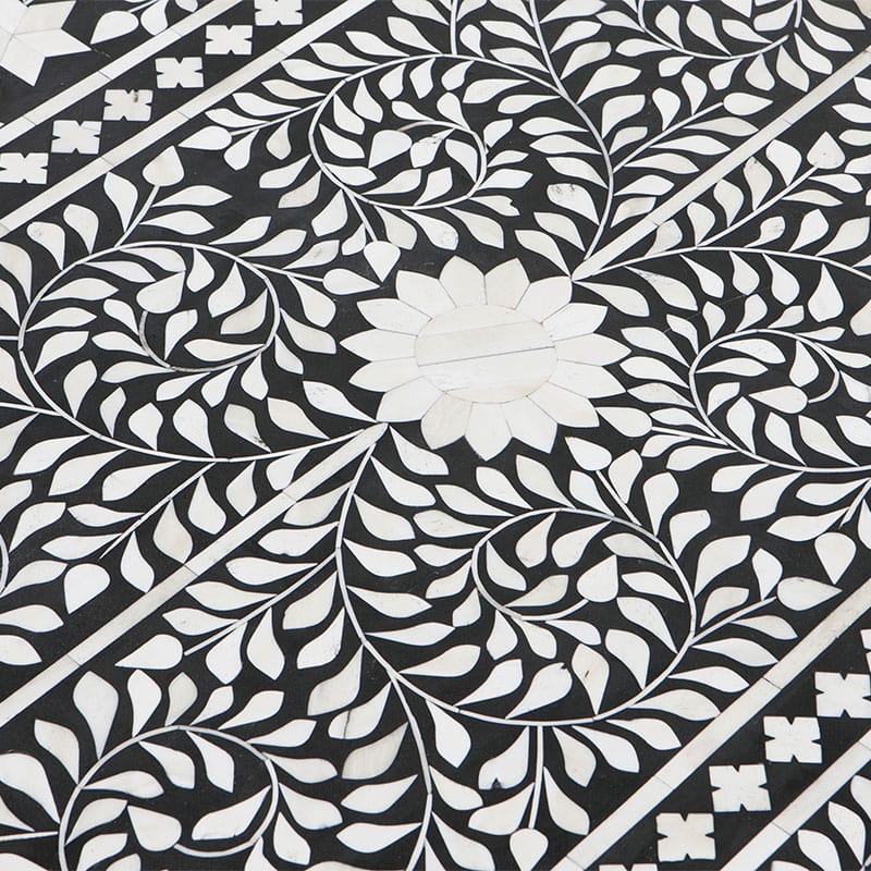 伝統的な骨インレイ技術を施したこのテーブルは複雑な幾何学的パターンと花模様のモノクロデザインが特徴です。